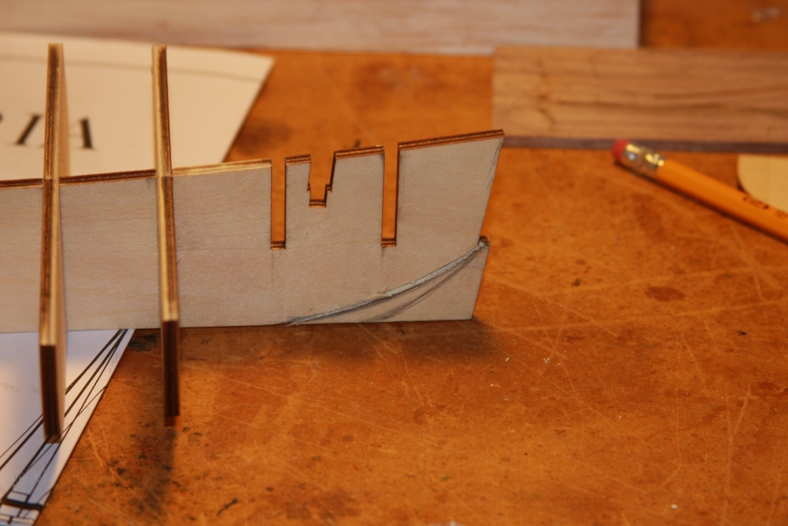 Later, when the hull is planked, each piece of the hull will need to be steamed and bent to complete the “sweep” toward the keel. To help ease that process, I filled in the stern with balsa wood.