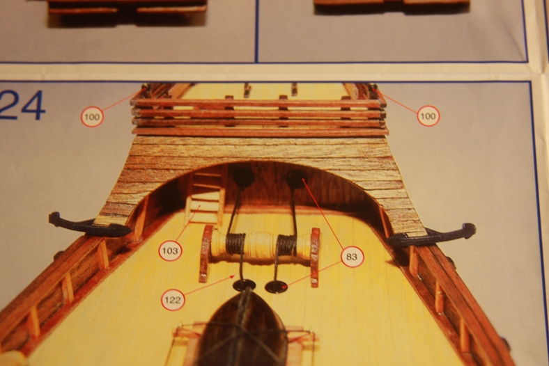The F’oc’sle, or forecastle of the ship is the forward deck which most times housed the foremast. The instructions for this particular kit show the windlass (the gear that raises and lowers the anchors) running ropes through to holes in a forward wall and down to the anchors.
