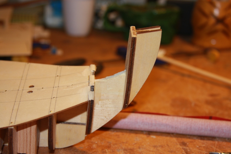 My task was remove this extra bulkhead and make the ship more accurate. I trimmed the forward bulkhead, then added to support blocks to accomodate where the foremast hole will be drilled.