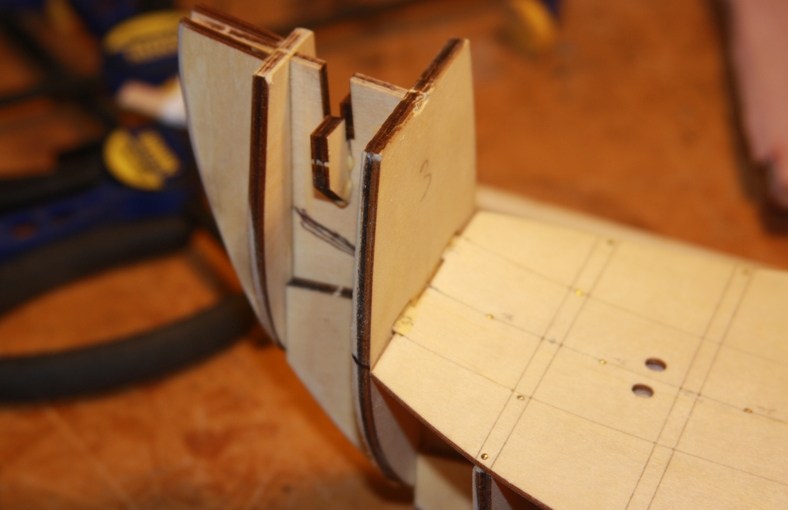 My task was remove this extra bulkhead and make the ship more accurate. I trimmed the forward bulkhead, then added to support blocks to accomodate where the foremast hole will be drilled.