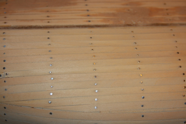 However, the first layer of planking must still provide an even, smooth surface otherwise the thinner outer layer will appear bumpy and incorrect. The first layer of planking will be sanded until it’s reasonably smooth then wood filler is applied to even out any inconsistencies.