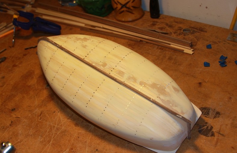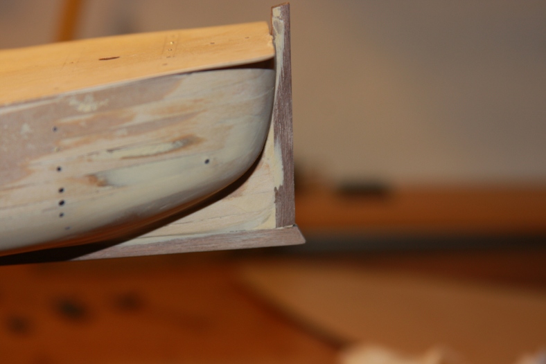 The keel is added by gluing it and holding it in place with a variety of rubber bands and clamps. I then add another layer of filler to close all the gaps where the planks meeet the keel.