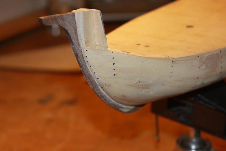 Then, still more sanding to make the hull as smooth as possible around all the edges and between all the planks. The smoother the first layer of planking is, the more even the second layer of planking will be.