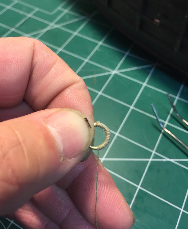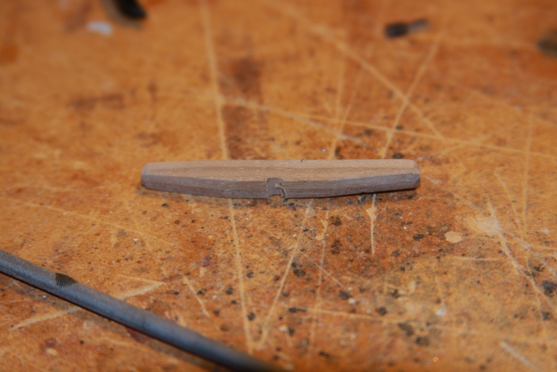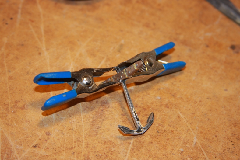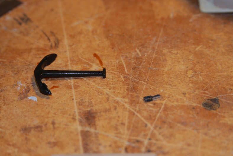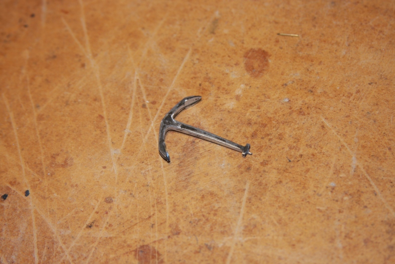 To mount the anchor itself, I drilled a small hole in the top, and glued the end of a sewing pin into the end of the shank. Another small hole was drilled in the stock to fit the shank as well as the forelock.