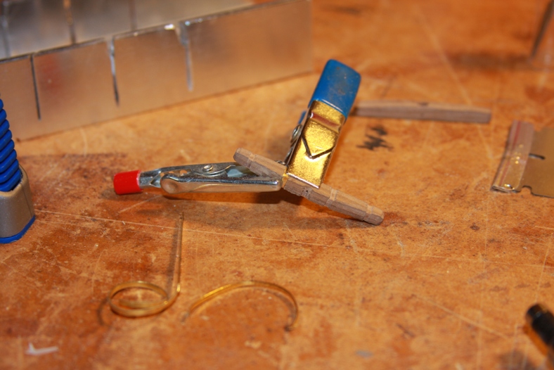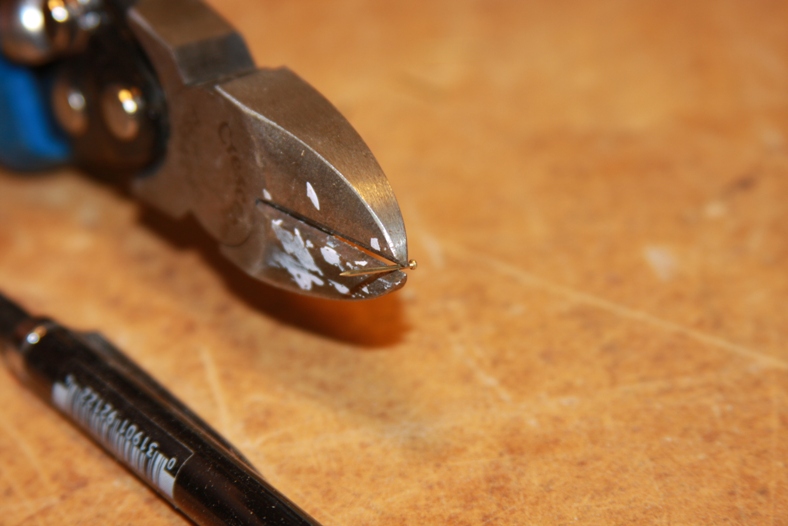 To create the bolts in the stock, I pre-drilled tiny holes into the sides, then clipped off the heads of pin nails and put them in. After they were nailed in, I tapped them repeatedly with a brass head hmmer to get them as flush as possible while still having them appear ’rounded’.