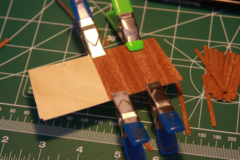 I started by cutting a sized template of two-layer thin plywood.  I planked the inside with the same mahogany  strips I used for the rest of the cabin.  The outside of the cabin is stripped with the walnut planks used on the rest of the hull – which is important because I plan on using the same stain pattern and color.