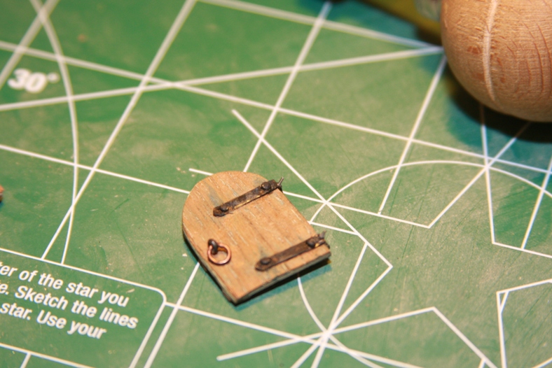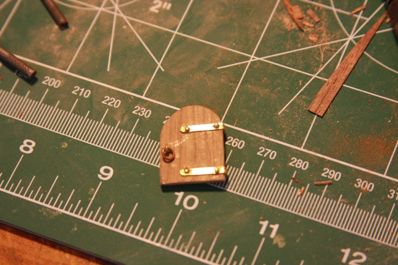 The door itself it cut, then fitted with brass hinges pinned down with brass pins. The pins have been cut to less than a millimeter, but the head is still showing. Then hinges and door are then aged with blackening patina. Also notice that there is crowning all around the inside and outside of the cabin wall.