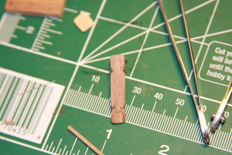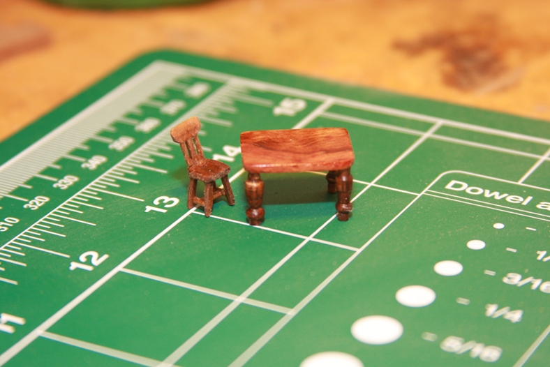 The legs of the desk were made from a 3mm diameter dowel that I inserted into my drill (same trick I often use) to create a make-shift lathe. I then used a variety of pin files to get the patter that I wanted. Once again, I went through many cases of the legs breaking off before I ended up with four good pieces. It was also very, very difficult to get four legs whose patterns looked close enough to one another to be acceptable.