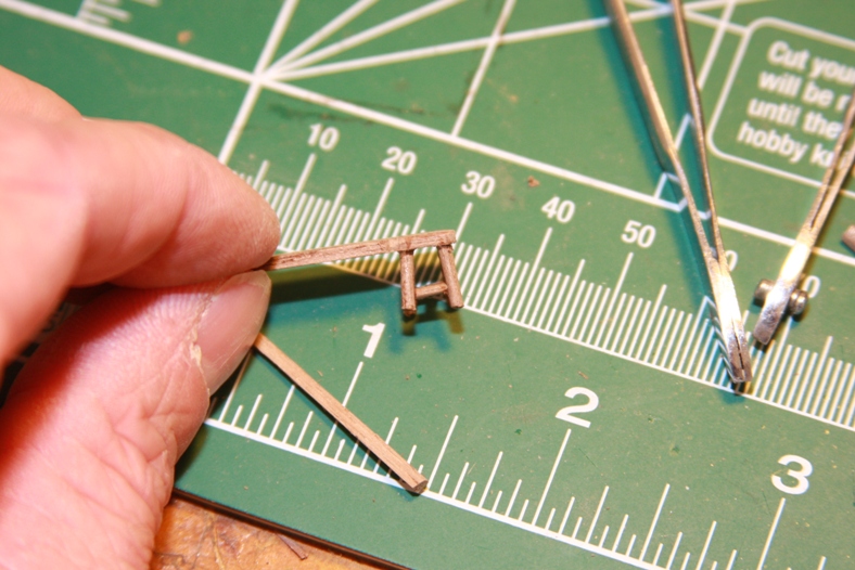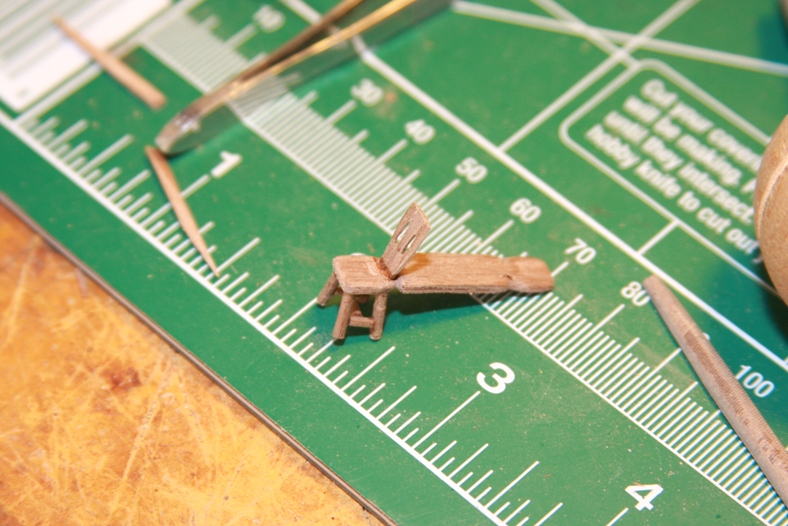 The original walnut piece was sanded to fit the shape of the seat.  The legs were sanded from a 2 mm diameter walnut dowel. This sanding was so delicate, that I went through several inches of the dowel just to get the four legs as well as the cross pieces.