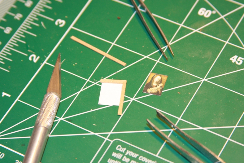 Each picture was selected from the time period, but it’s a complete guess on what a devout member of the church and essentially an employee of the monarchy would have brought along.The first frame is built with 2 X 2 mm strips of mahogany sanded down and mitered and the corners.  I mounted the strips onto a piece of printer paper to stabilize them. I used a sharpie to darken the back and mask any irregularities since the margin for error here was so slim.
