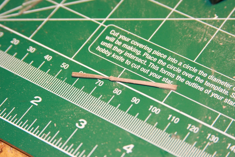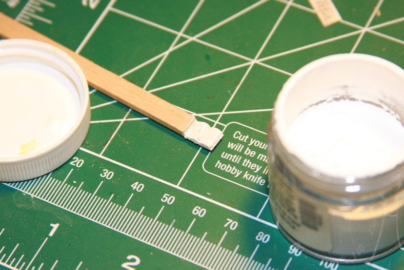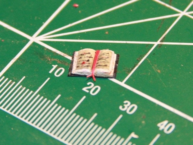 The balsa wood is sanded to shape with pin files and 600 – 1000 grain sand paper. No matter how fine the sand paper is, the balsa wood is not going to be perfectly smooth. This is an added bonus in this situation and gives the appearance of texture for the book.  The wood is then painted white and the edges are repeatedly scored with an x-acto knife to give the impression of several pages.