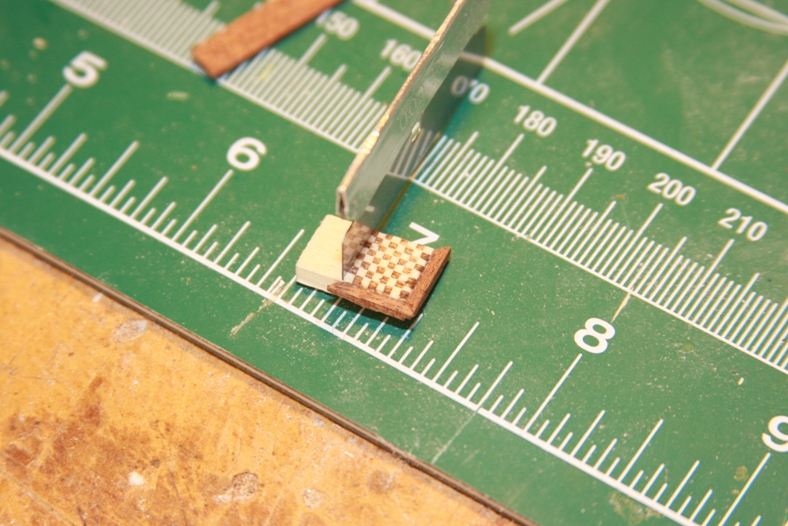 The board is made from a soft piece of pine.  Each set of squares is a mm wide, and the entire thing is boarded by 1.5 mm x 1.5 mm mahogany.  Coloring the squares was obviously a huge challenge.  I scored the wood at 1 mm intervals with a razor blade, then I used wood stain and a size 0 brush. Each drop of stain fell and spread within the square, but was successfully contained by the cuts in the wood!