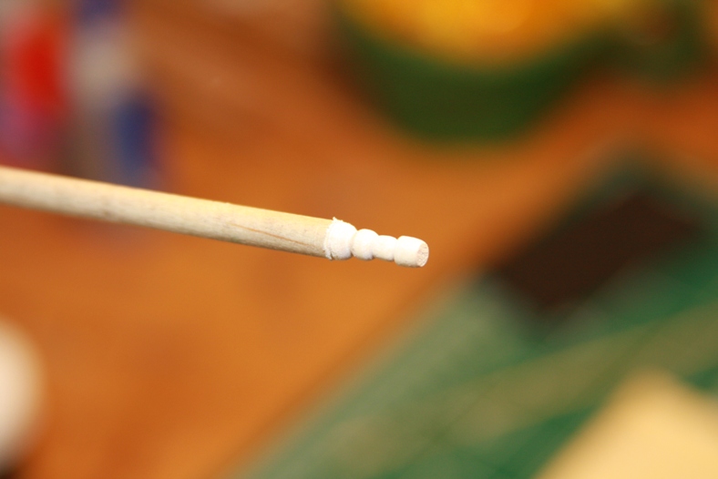 The blade is made from a 1.5 x 3 mm piece of walnut.  I chose walnut because I’ve had more success with the wood holding together while I sand it very small. Nonetheless, the sword still took a couple of tries before I managed a successful blade.  Even still, the handled snapped at one point and I had to superglue it back together. The good news is, that was covered by the paint.