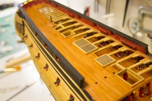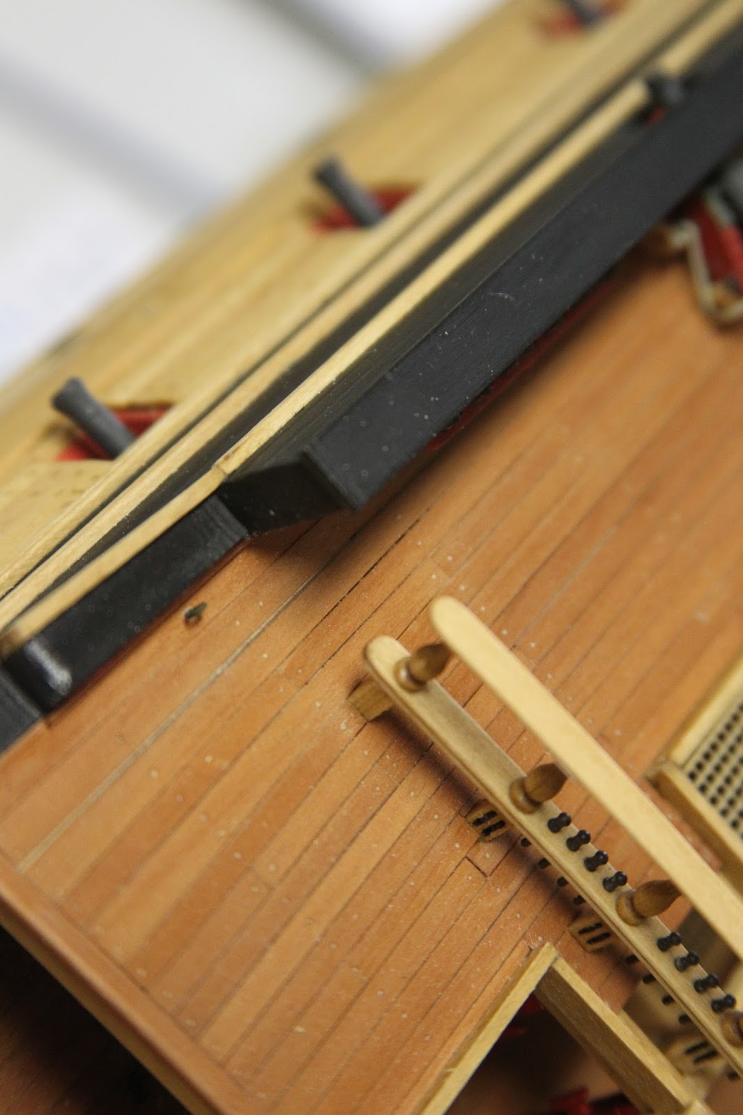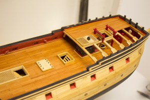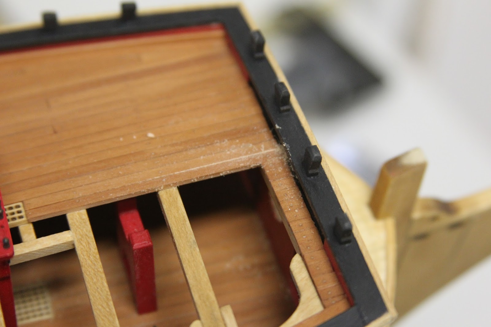 I spent the weekend in the shipyard doing some initial repairs, then some new work. Because Augie hadn’t been able to work on the Confederacy for quite some time, it had collected a little bit of dust and had a small amount of disrepair, including some deck planks that had separated a bit and seemed uneven. So I cleared off some of the cannons and fittings, resurfaced the deck, filled in gaps with sawdust from sanded down Swiss Pear, then applied some tung oil and a light coat of satin poly. I also ended up touching up some of the black and red paint that had been negatively affected by dust, etc.