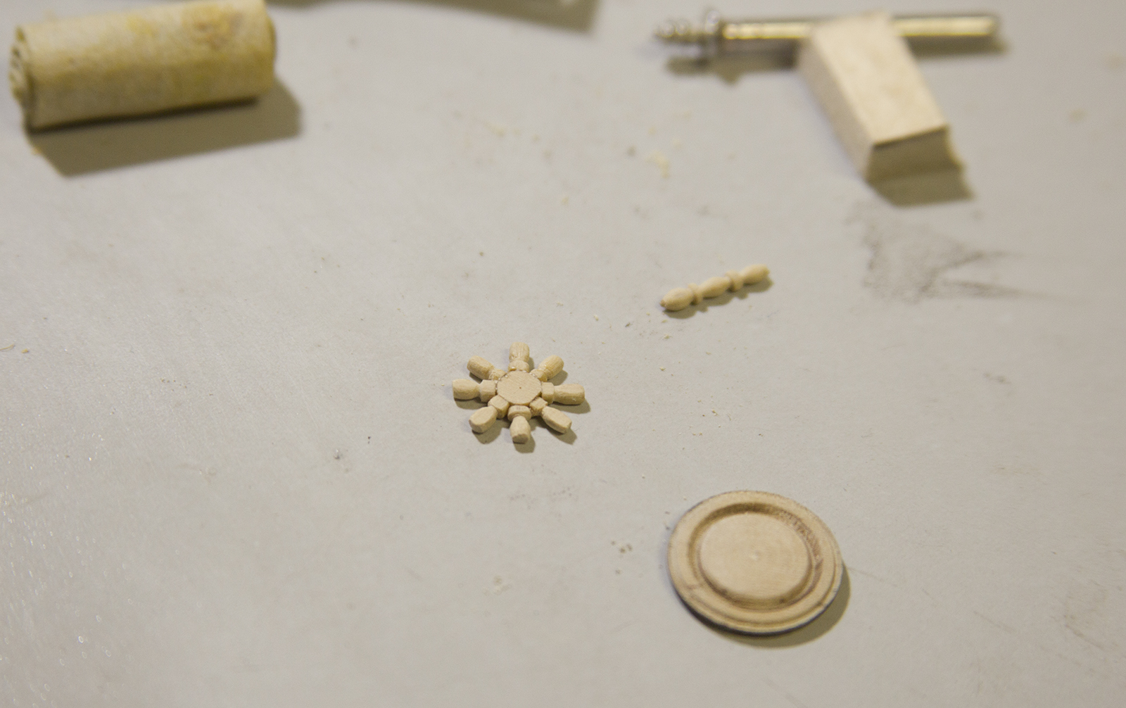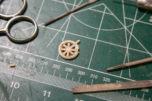 I cut it square, rounded the edges, then mounted it on the Dremel as before. I smoothed out the top and bottom and used my mini level to make sure it was even. I used miniature files to care out the edges and give the wheel some shape. For the spokes, I used a strip of boxwood, split it to 2mm, then rounded it with sand paper. Once again mounting it into my Dremel Lathe, I used a miniature file to shape the spokes.