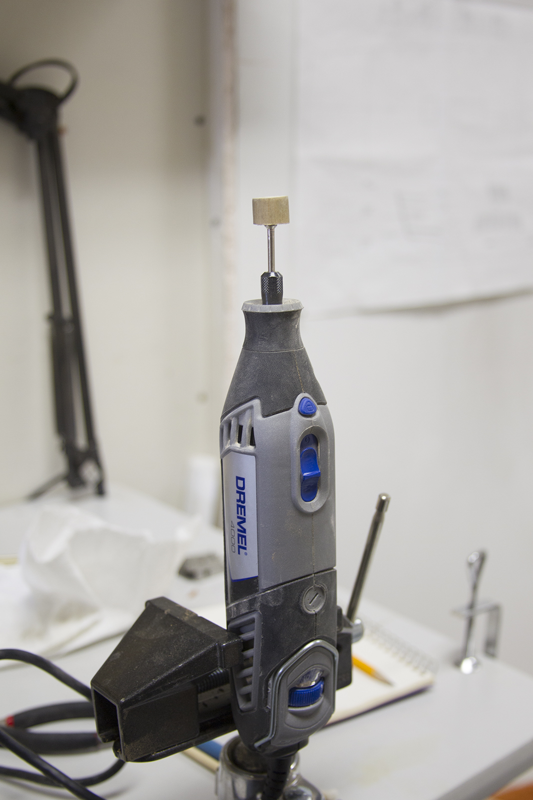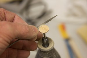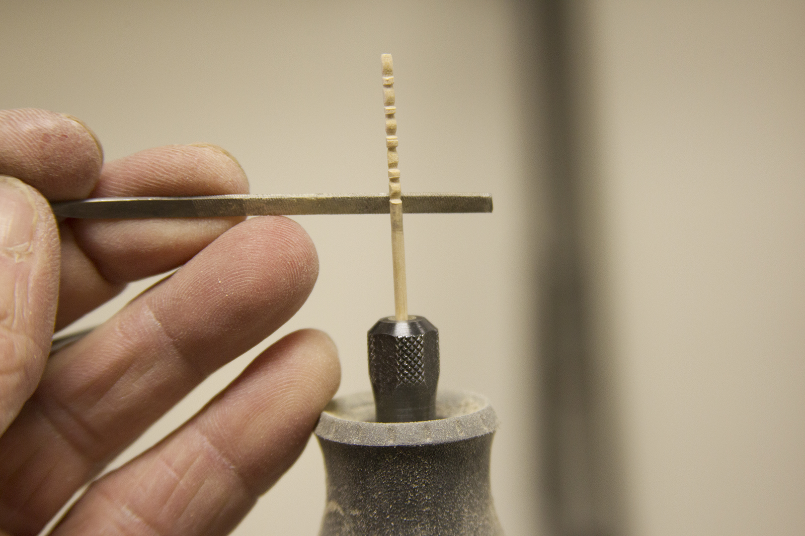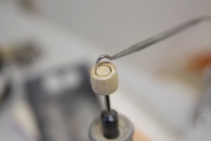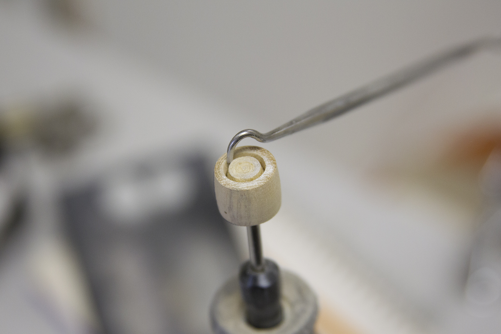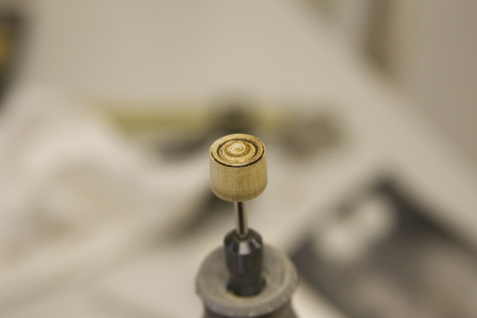 For Attempt #1, I cut off part of a dowel that was 15mm in diameter – the same diameter as the existing wheels. I mounted it onto my Dremel vertically, using a small screw attachment to create a version of a lathe. Then I used dental tools to notch and carve the piece giving it texture.