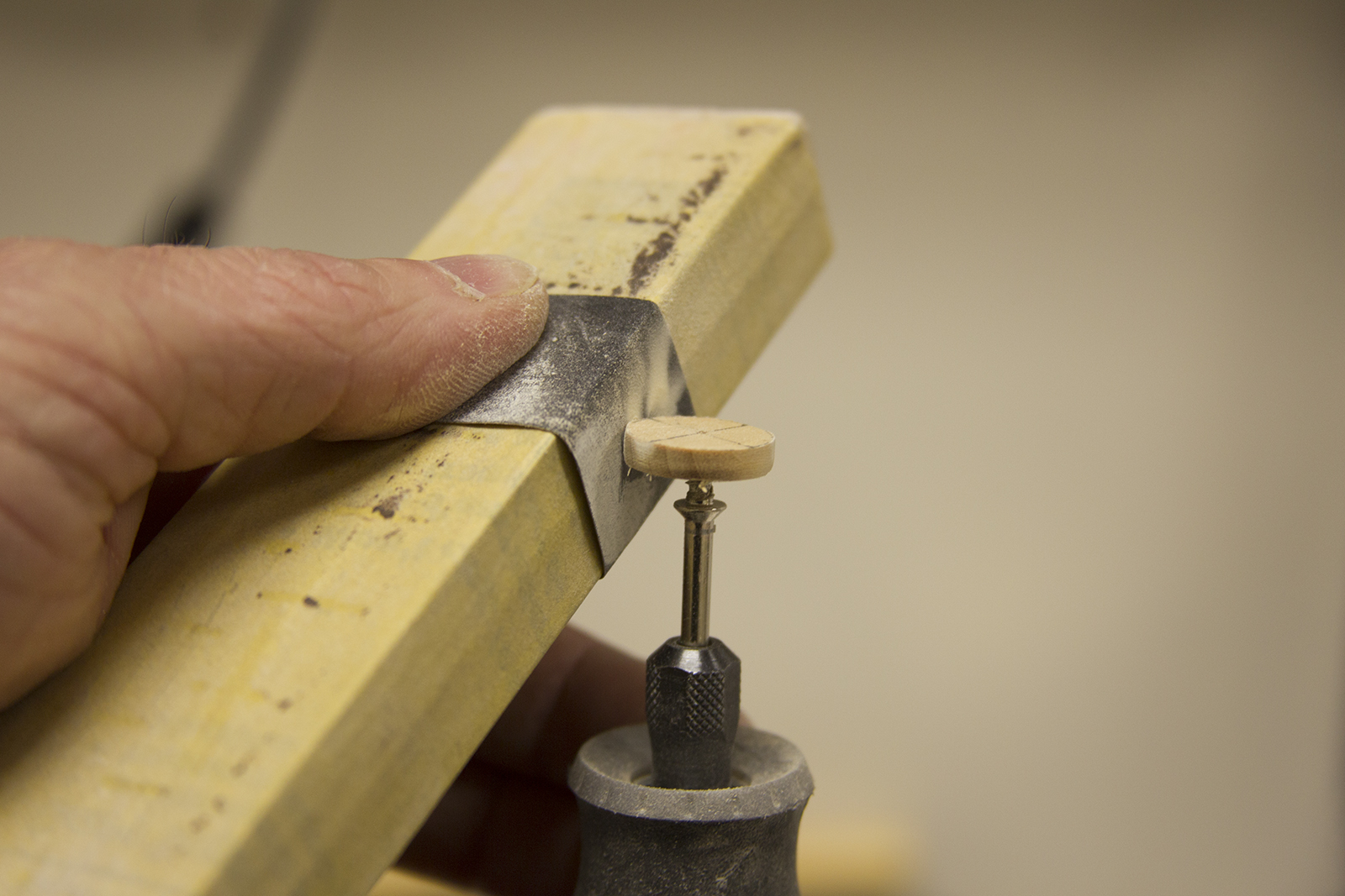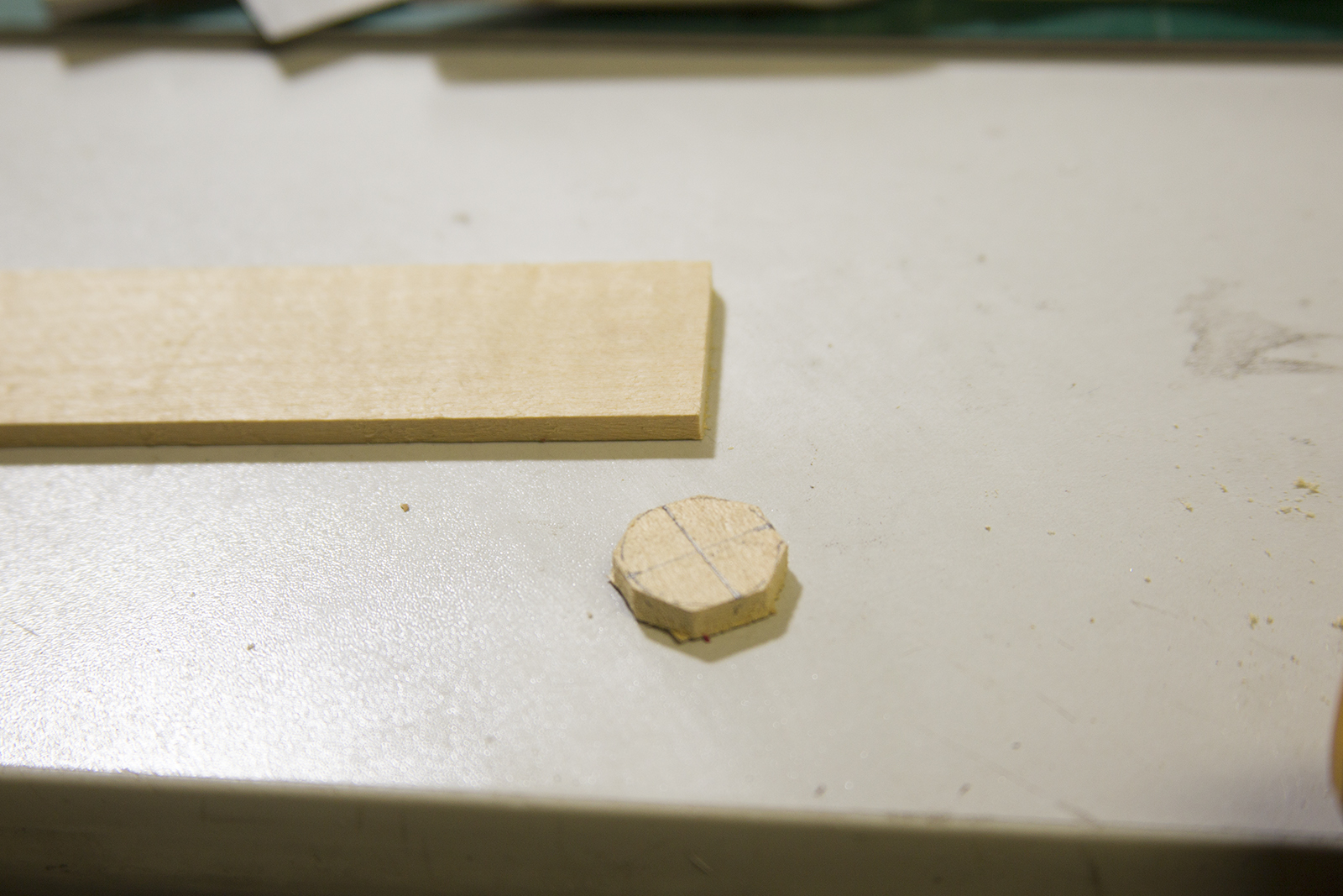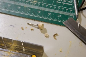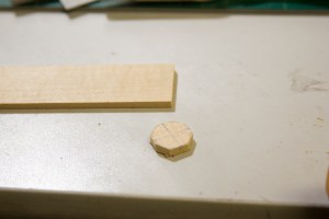 However, because the kind of wood I used was hard, but a little too porous and brittle, it crumbled when I attempted to cut it off the end of the dowel with it’s new shape. Drat.