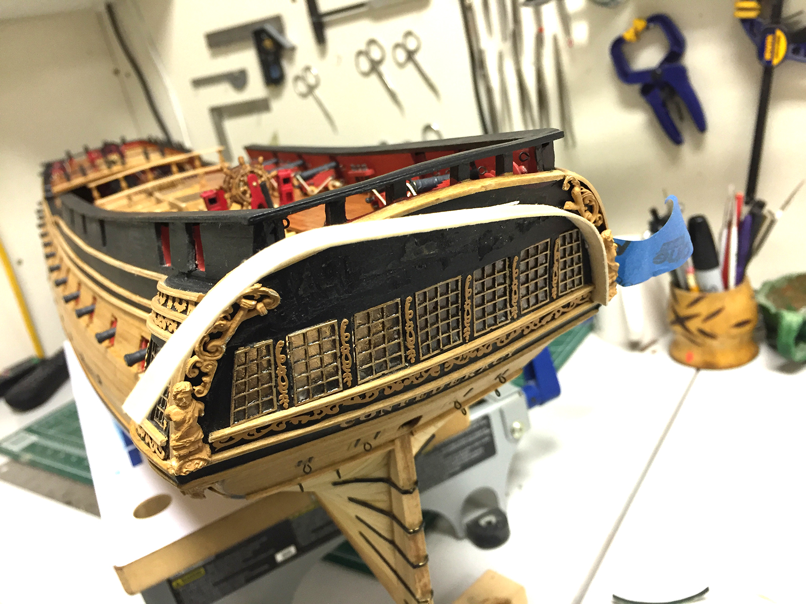 Continuing my repair process, and cleaning up some of the ship, I got a good bit of work done on the Transom. It took a couple bumps and bruises along the way, and some of the paint had shipped off the figures, and created some blemishes on the black. Also – I wanted to touch up the window frames a bit. Augie did such an awesome job with the window “glass” that I wanted to even out the finish and color of the frames to match the rest of the smooth look and feel of what he had going.