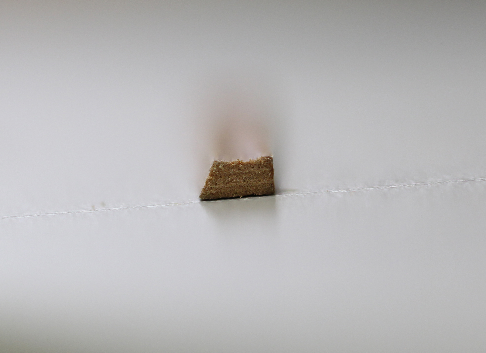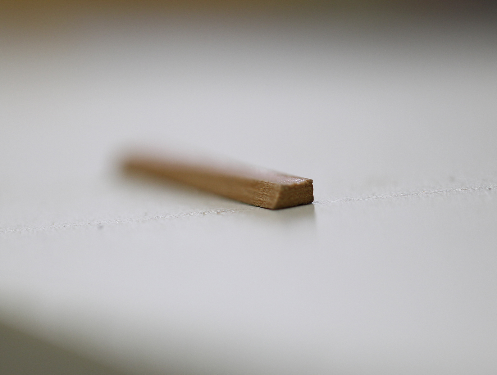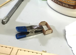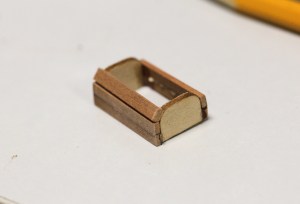 Chuck’s original plans & instructions call for a bit of 28 gauge wire glued under the overhang, which is a very nice touch to give it a sense of crown molding and insulation. Instead – for me to pull in a little bit of the natural color of the bow, I used the original light colored overhang, sanded it down, then covered it with the swiss pear roof.