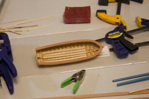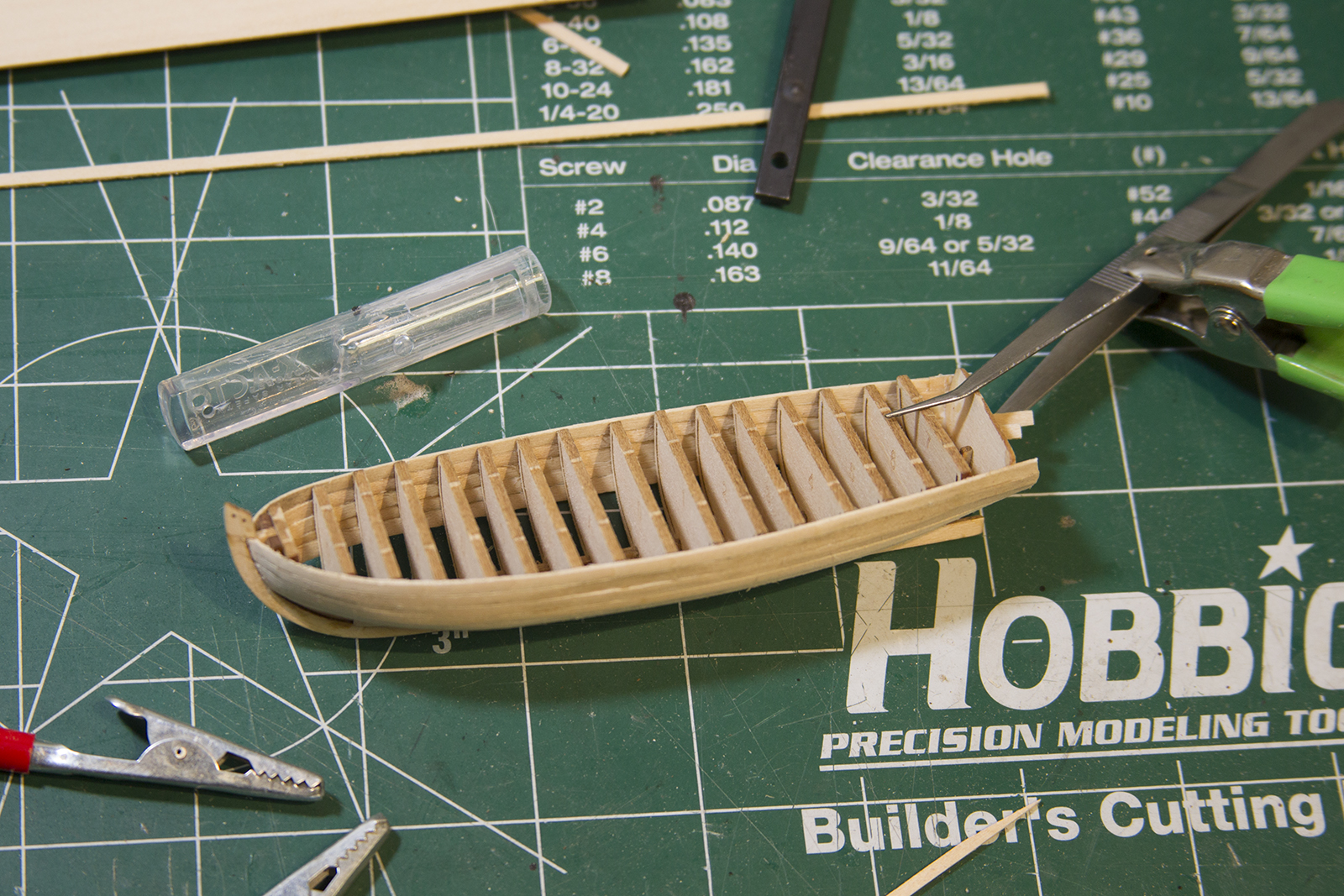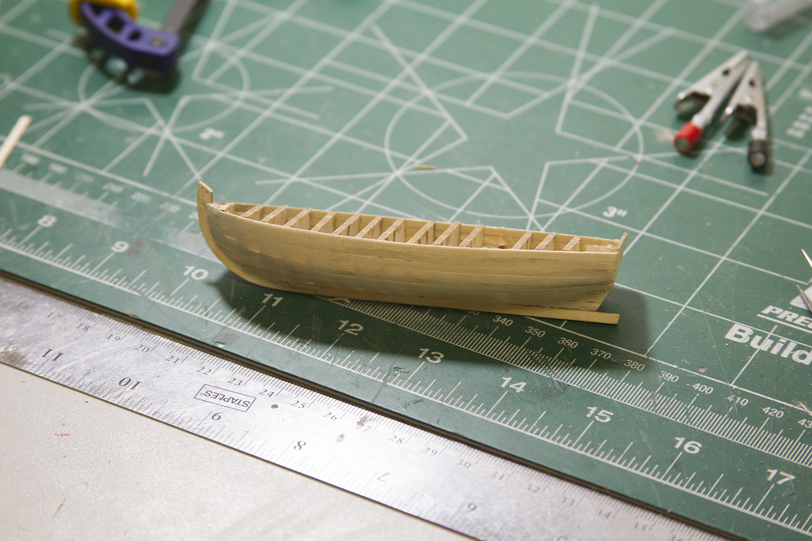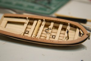 The risers (two strip along to side) are added as well as the “thwarts” or seats. Each of the seats is measured and ‘scored’ with a gouge along the edge. It was pretty tricky getting a good score along the edges of the seats. I wish I’d have taken a picture of it, but my method was to pinch sharp tweezers (you can actually see the tweezers I used in the photo below) together with a small piece of wood between them to keep the ends a consistent distance apart. Then I dragged one tip along the outside of the strip of I wanted to score as a guide – while using the other tip to score the wood.