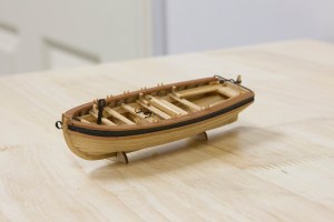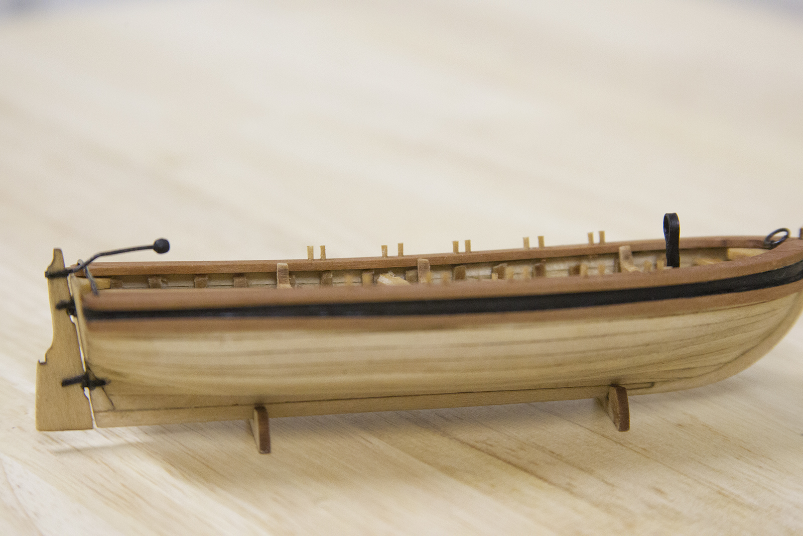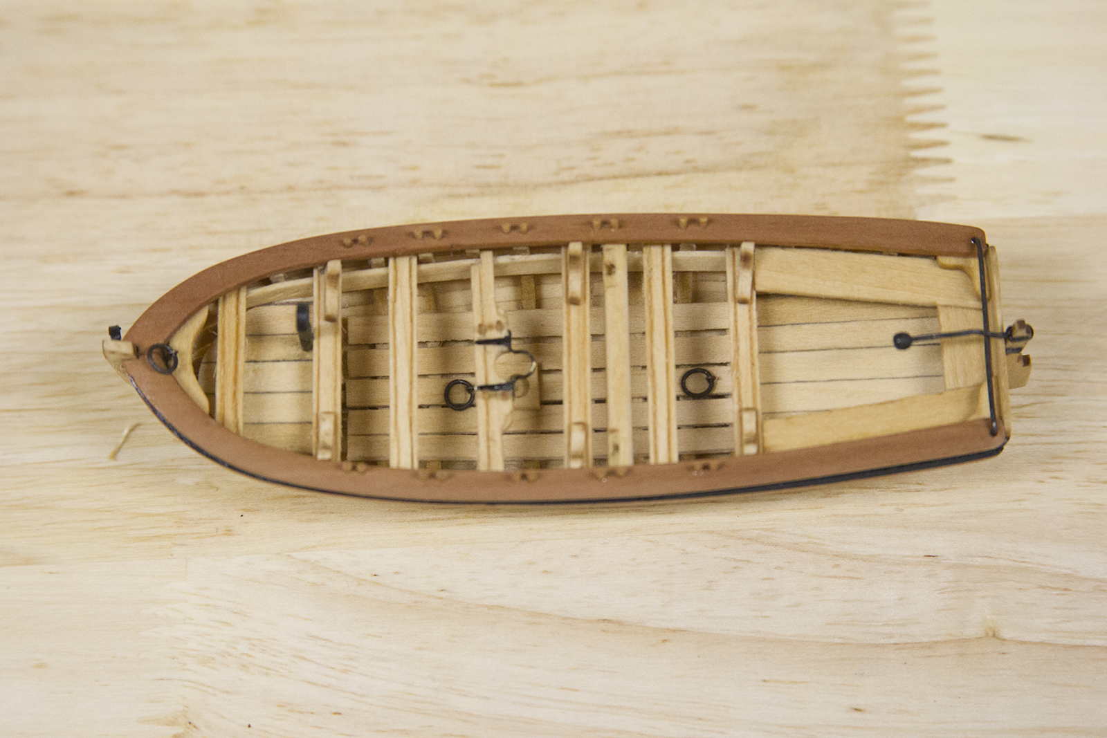 The rear seats, knees (small braces along the inboard hull and frame), and windlass are added to the boat. The rigging rings that were used to mount and unmount the ship are also added after being put together and blackened. The two rings on the front seat and bow of the ship are bowsprit rings – folded strips of brass that are moulded around a dowel to create a ring, then glued together and inserted into the boat.