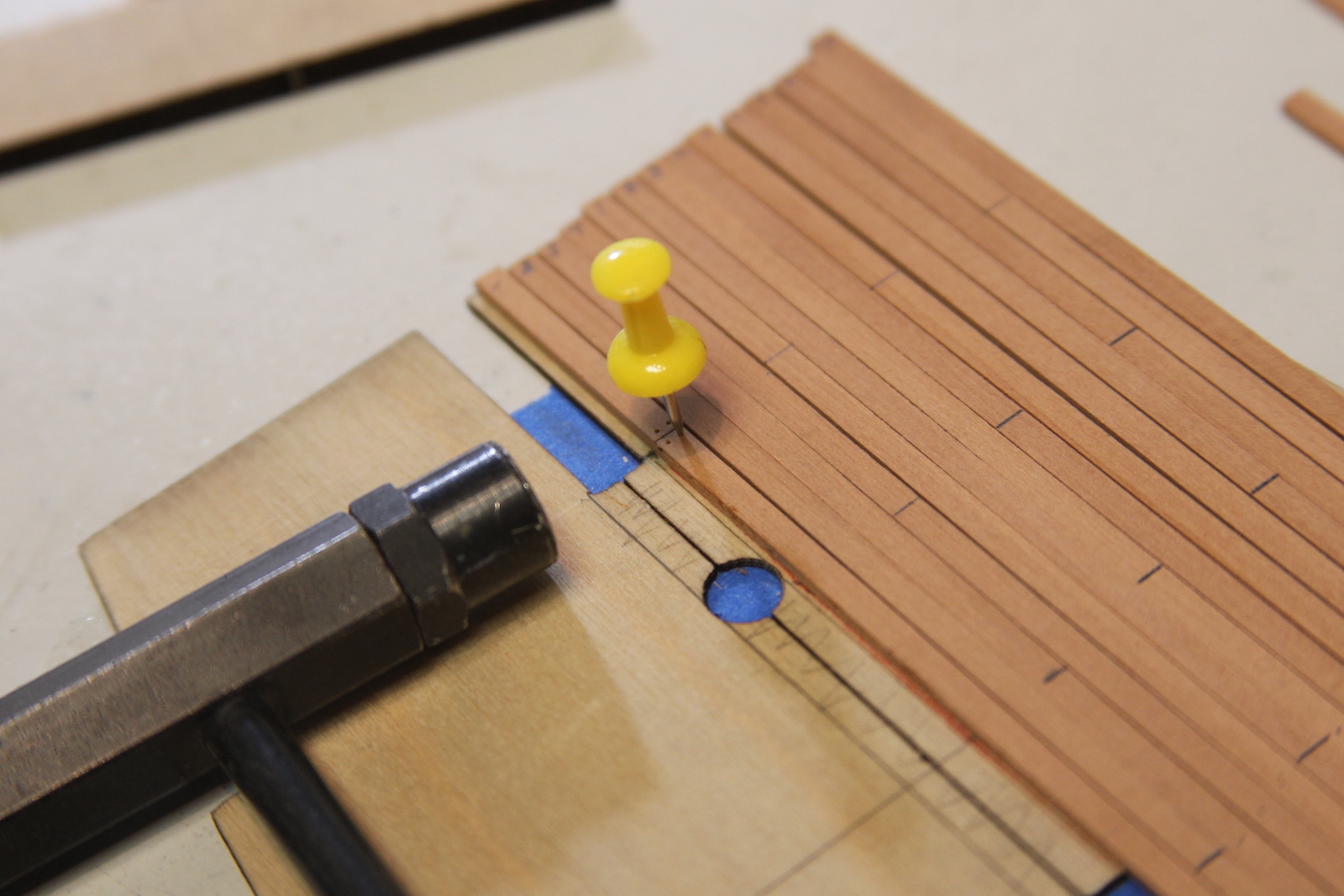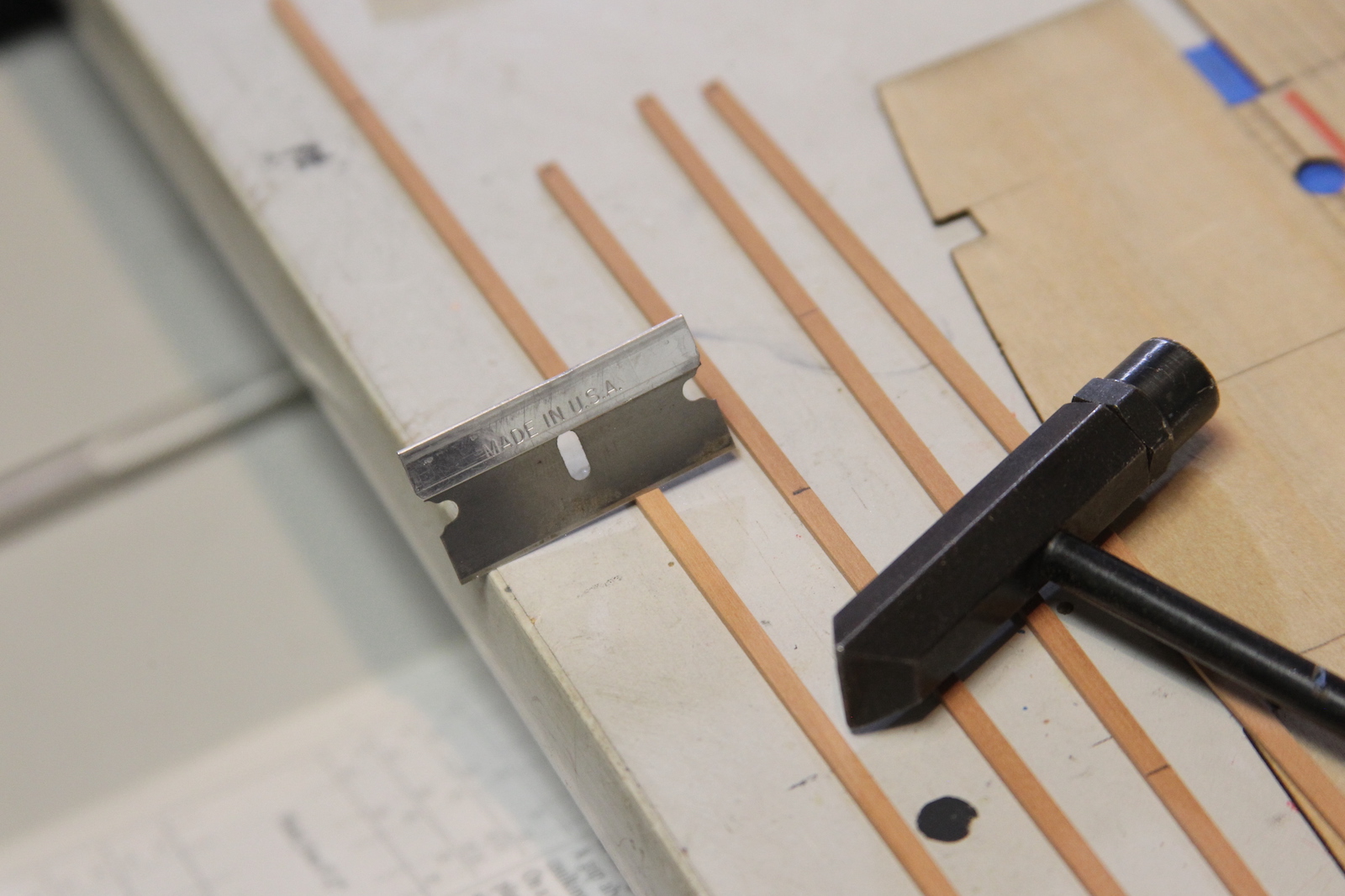 As far as planking itself – I’m going to run a 1/8″ centerline “King” plank, then mirror each side with 1/16″ planks that run the length of the deck. It’s much easier to plank the length, then simulate the end butts with a few taps of a razor blade.