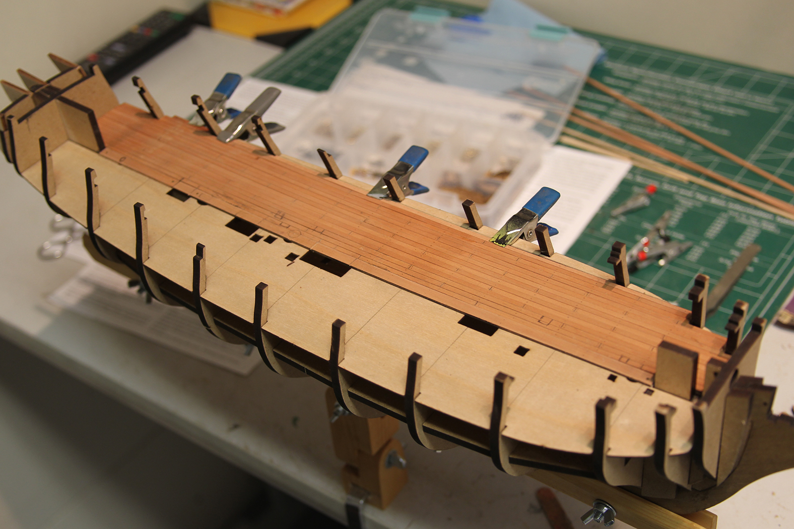 Peg’s plans call for planking the lower deck prior to mounting it to the frame. The false deck (shown above with my color lines, etc) is split into two pieces to facilitate mounting – which is great. But, if I proceed that way, I have no means of mounting the king plank and spreading the rest of the patter outward from that. So – contrary to the plans, I found it much easier to planks the lower deck after it was mounted to the frame. I followed the pattern I laid out on the false deck, keeping in mind that I had to cut and shift the planks as I got near the edges. I briefly mulled over the idea of creating a waterway/gutter (a specific additional water tight plank along the edges of the deck) along the sides, but ultimately ditched the idea for the lower deck as it’s a fair amount of work that isn’t likely to ever been seen; and would prove challenging based on how the frames are put together. Perhaps for the upper deck.