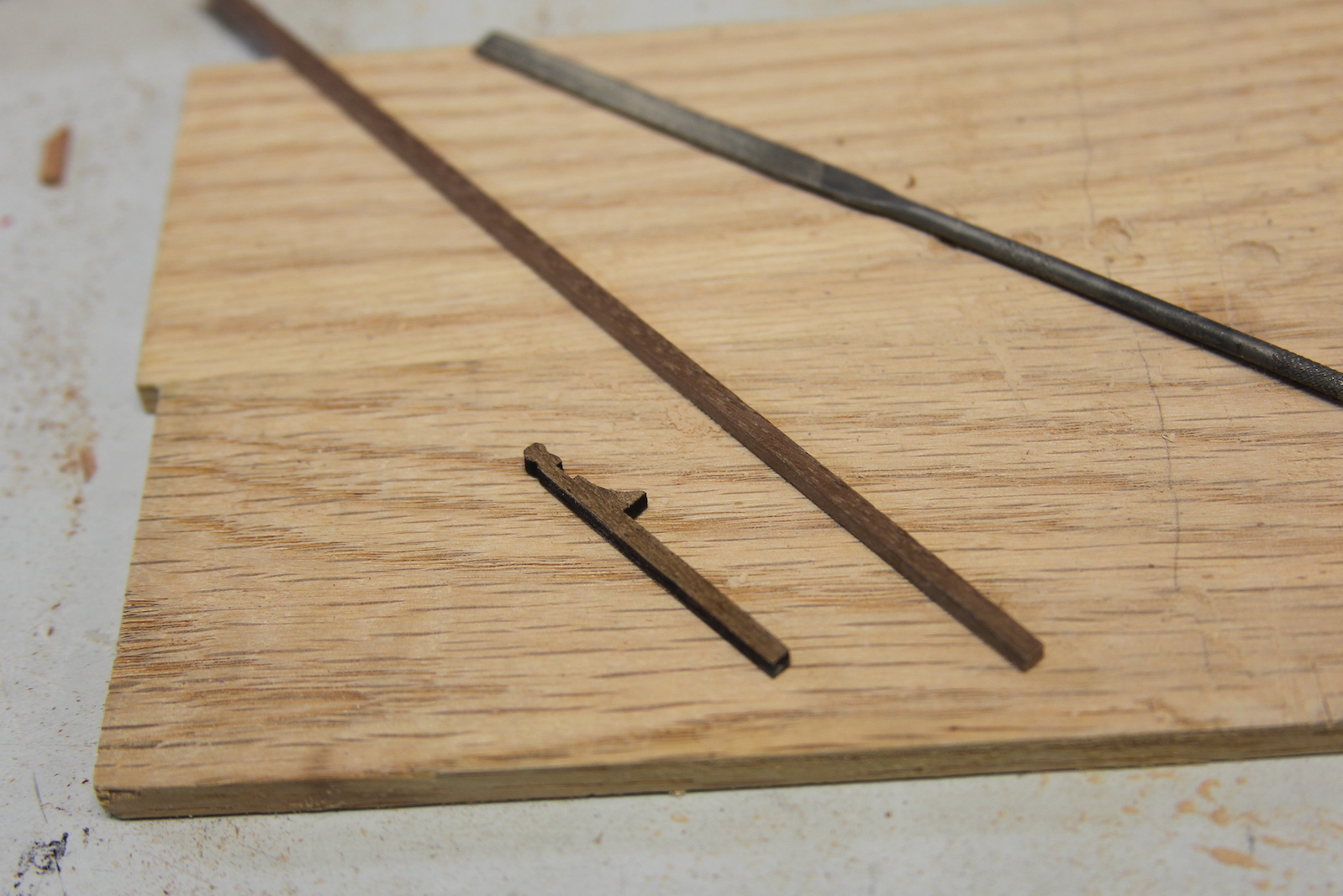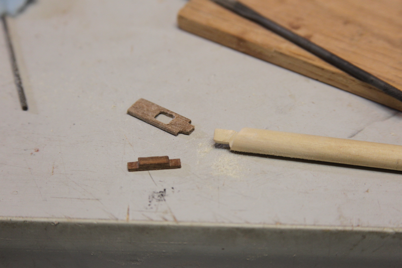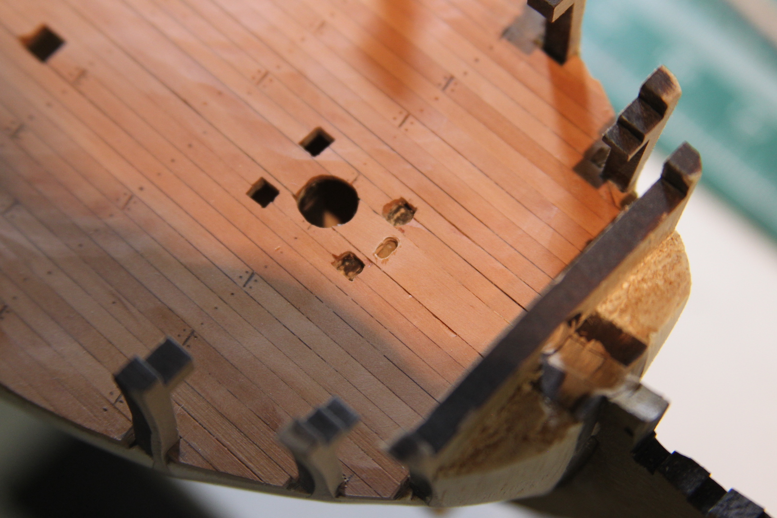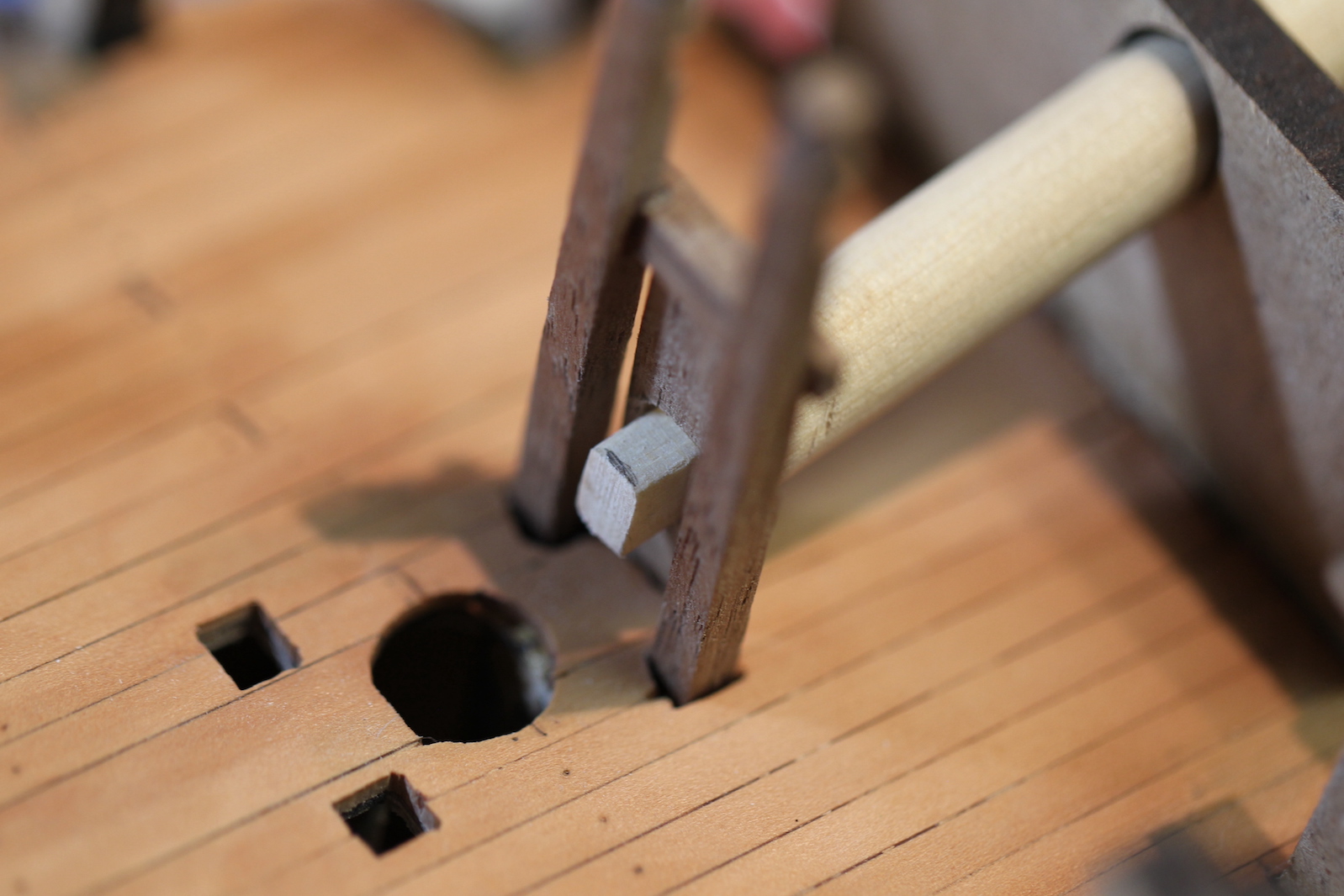 Peg’s plans have a solid piece of material toward the bow of the ship that adds extra support to the quarter deck. The Bowsprit itself is inserted into the bow and rests against this material. In a ‘real’ ship, the bowsprit extends into the lower deck and is held into a place by columns that contain rigging bitts. I’ve added these (and a couple other) elements to the lower deck.