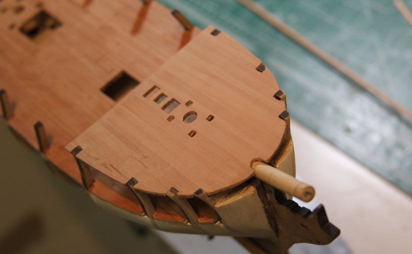Peg’s plans have a solid piece of material toward the bow of the ship that adds extra support to the quarter deck. The Bowsprit itself is inserted into the bow and rests against this material. In a ‘real’ ship, the bowsprit extends into the lower deck and is held into a place by columns that contain rigging bitts. I’ve added these (and a couple other) elements to the lower deck.
