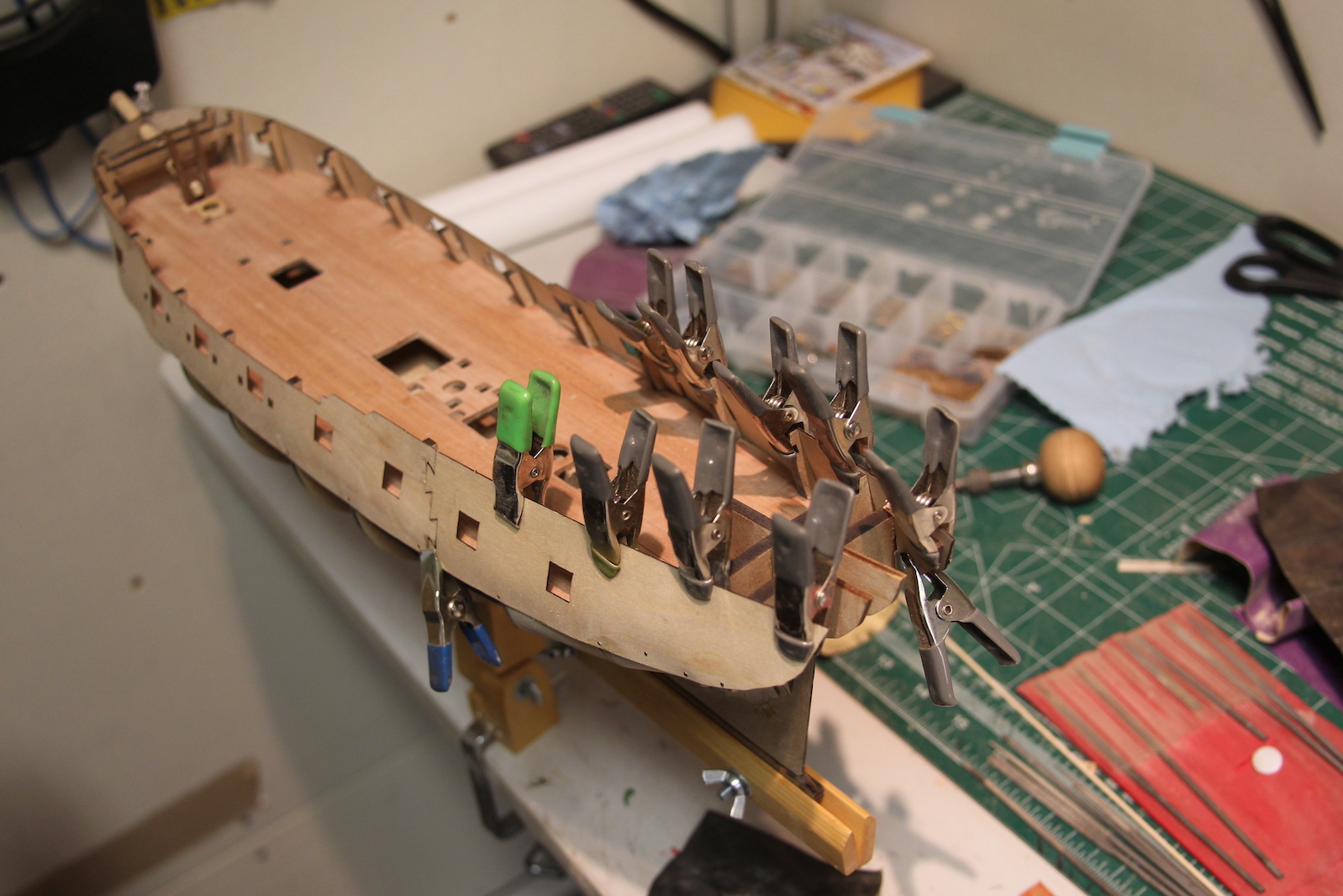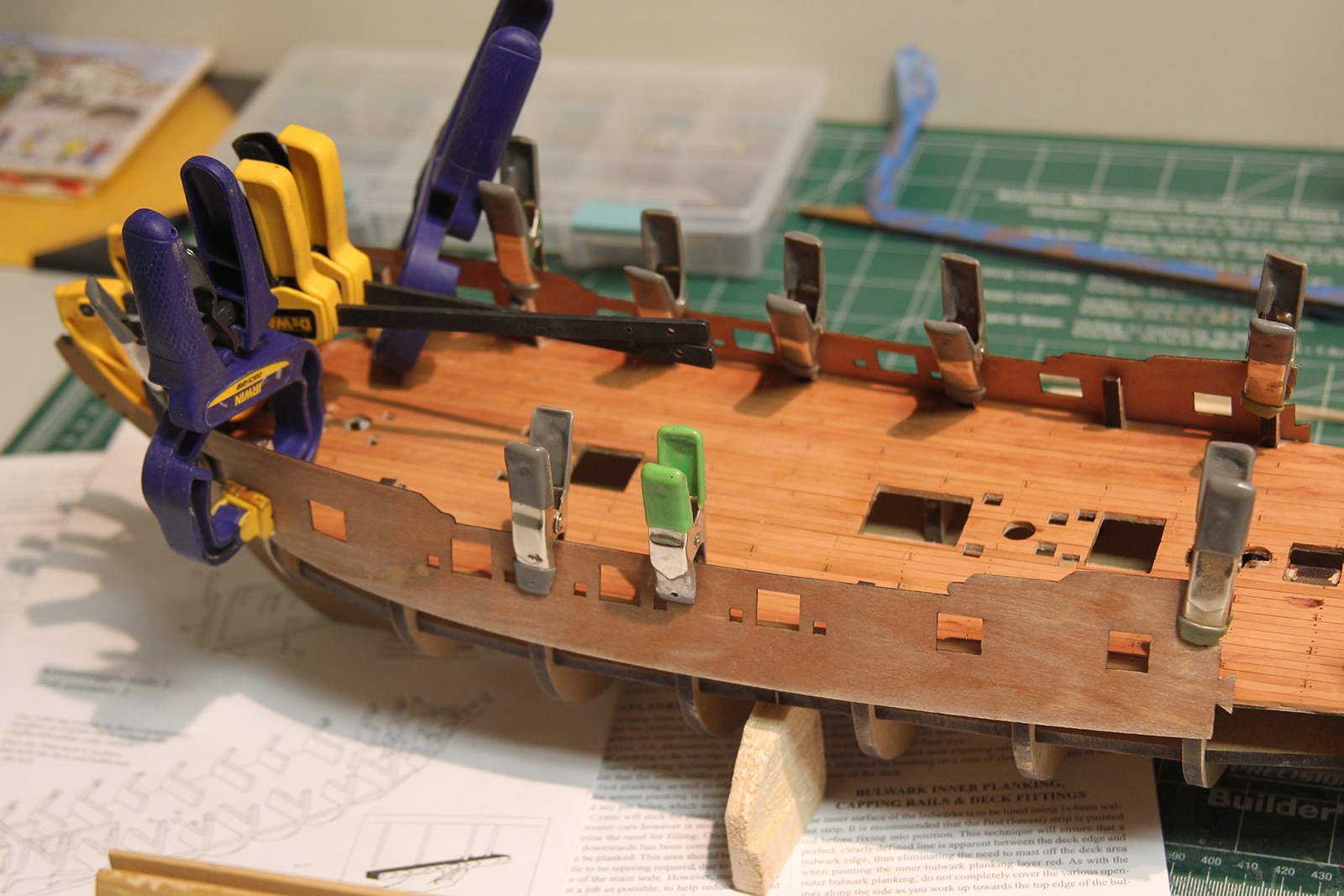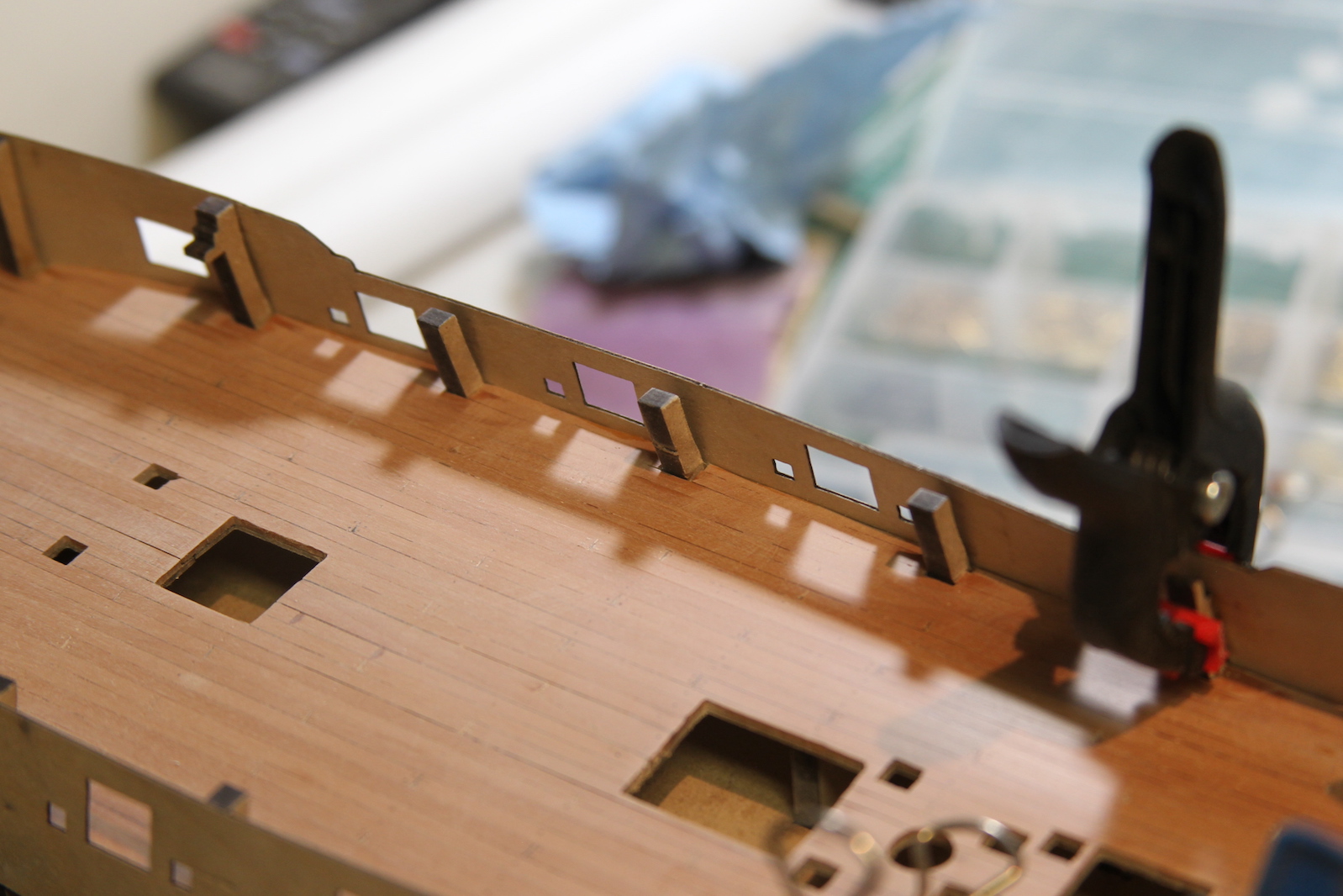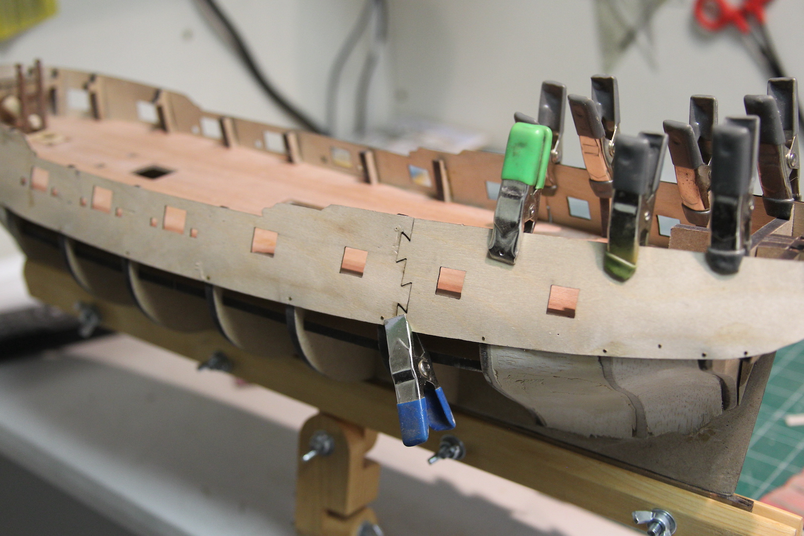 To get the gun ports even and accurate, I soaked them in water for a couple hours to loosen them up, then clamped them to the sides of the ship – careful to line up the ridges with the bulwark posts that extend up through the deck. Then I left them there overnight to dry in that fixed position.