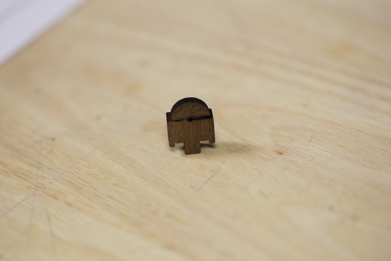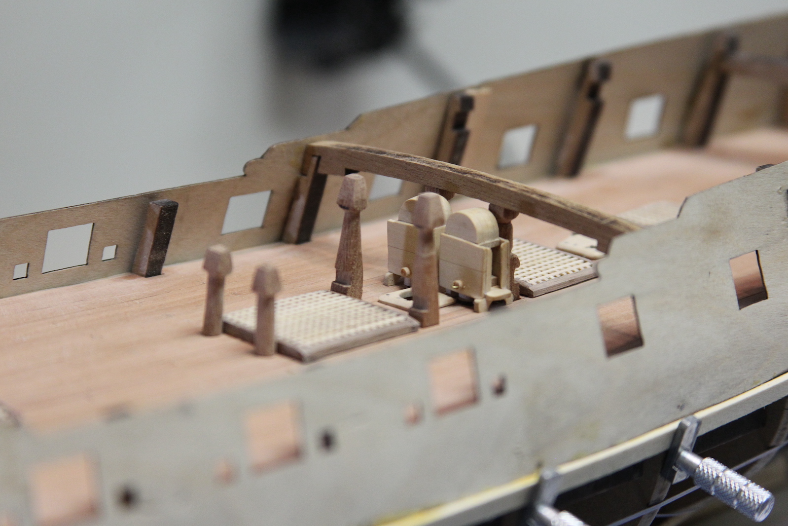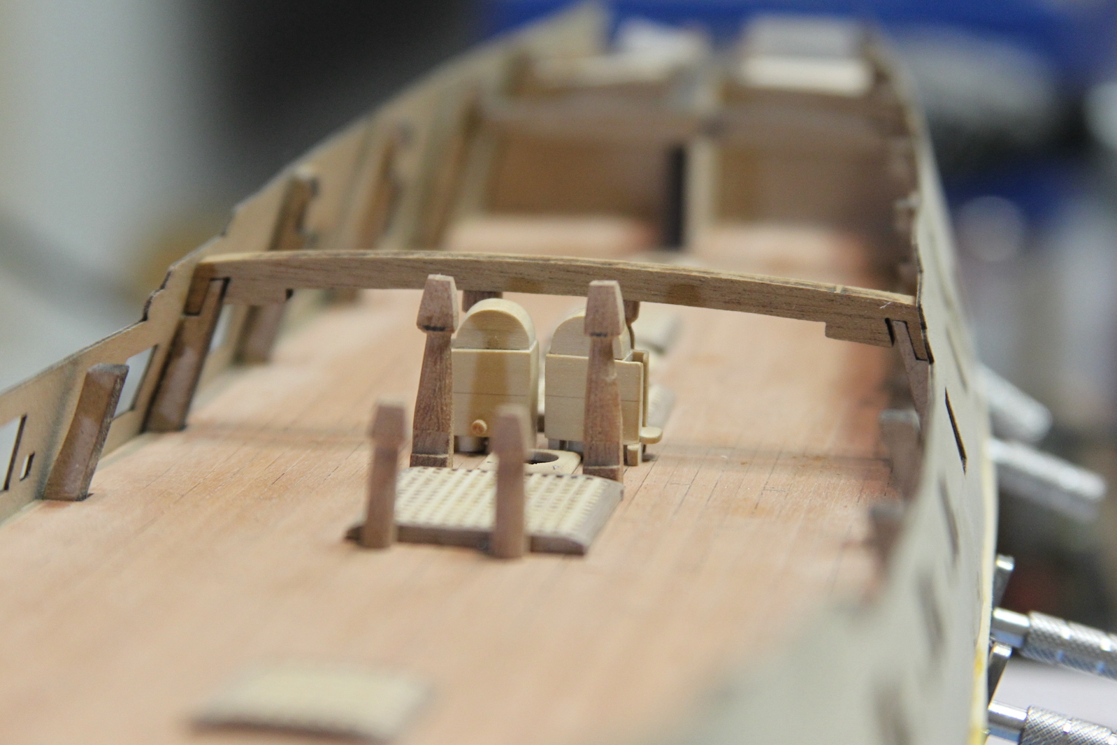 The pumps are fitted on the deck to see how they’ll line up with the really limited space between the grates and the mast partner. Then, it’s on to the chain cover. I glued together more boxwood pieces to create a sizable piece I could carve out and sand into a half circle. One the bottom of the cisterns are two pump drains. In a real ship this run all the way down into the hull so they suck up any bilge. They’re represented here by small circles that are flush with the deck.