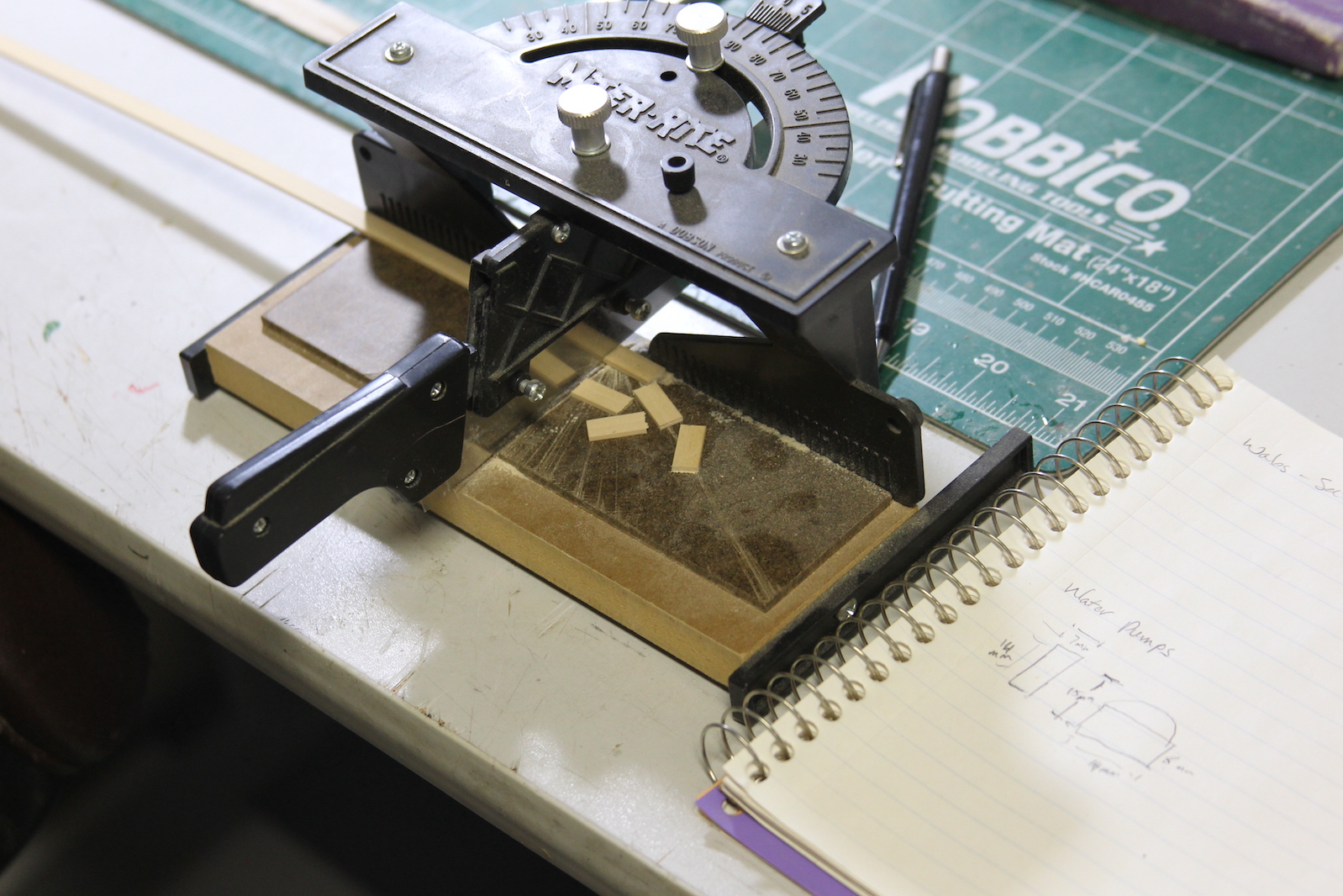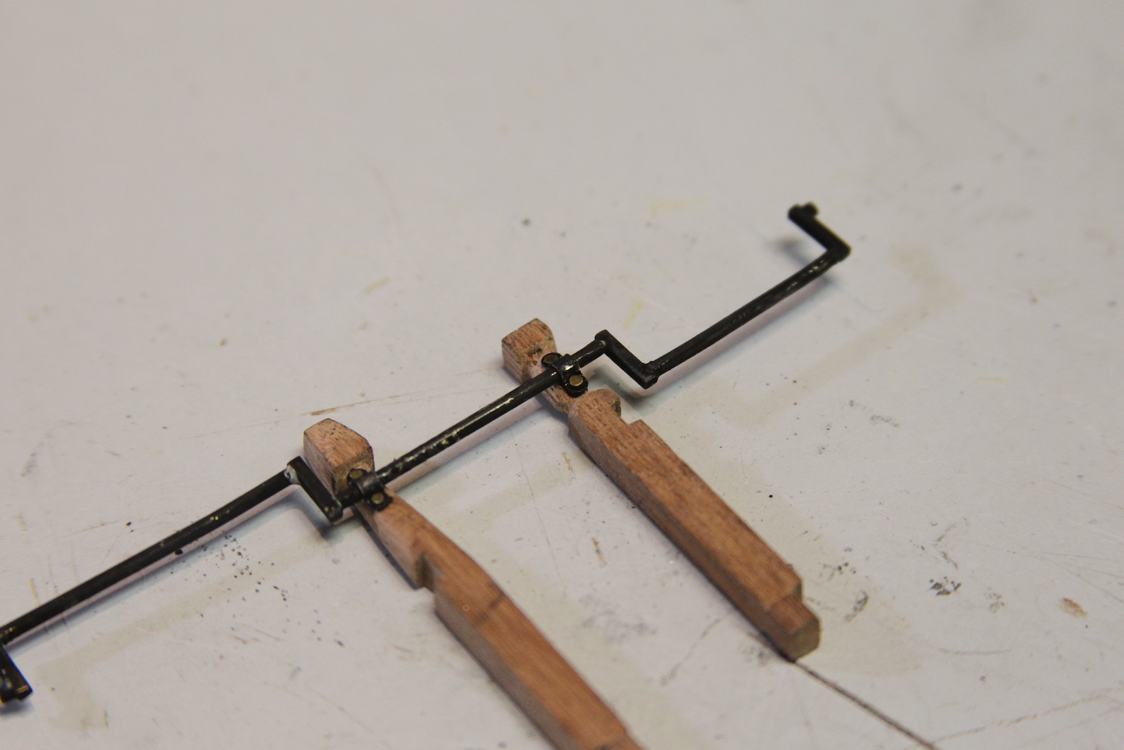 As I mentioned, the pumps themselves are worked manually with a crank (see below) that is attached to and through columns and bitts on either side of the cisterns. These pillars are pretty bland in the kit as well, but I used those as templates to create some that are a bit more pleasing to the eye but still functional. The pillars are carved out of mahogany then turned on a lathe must the same as a modern table leg – except way smaller of course. Mounting holes are also drilled into the posts which will hold the crank using my snazzy new miniature drill press from Micro-Mark.