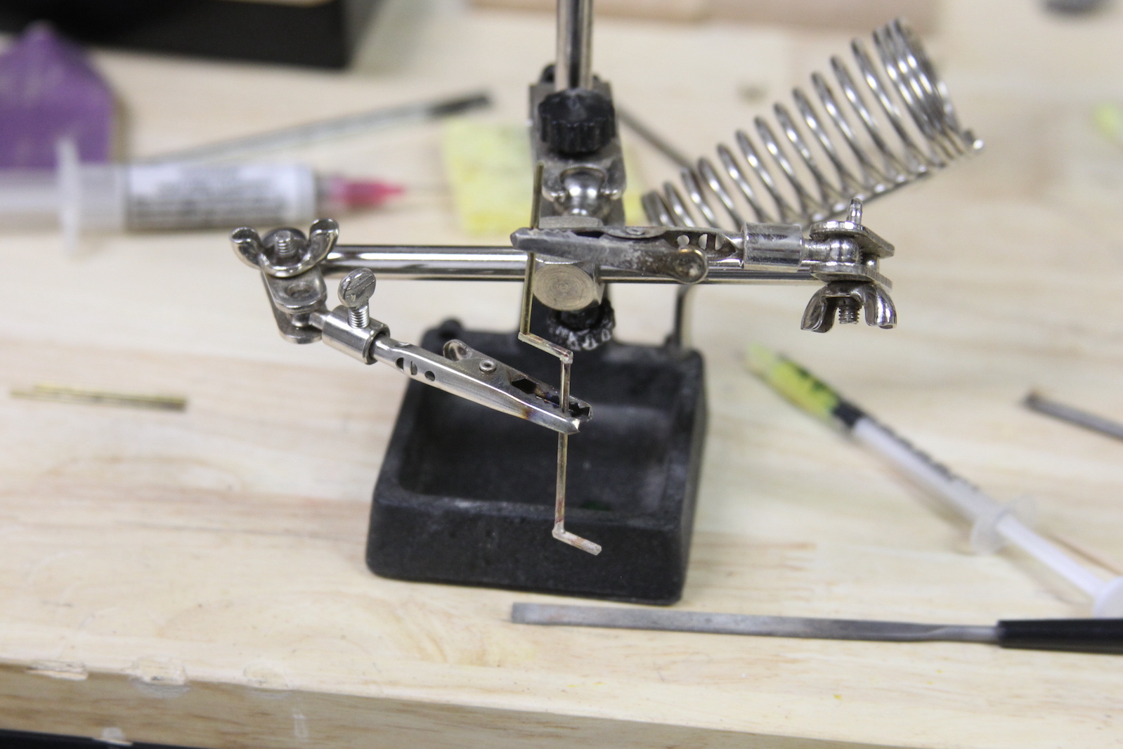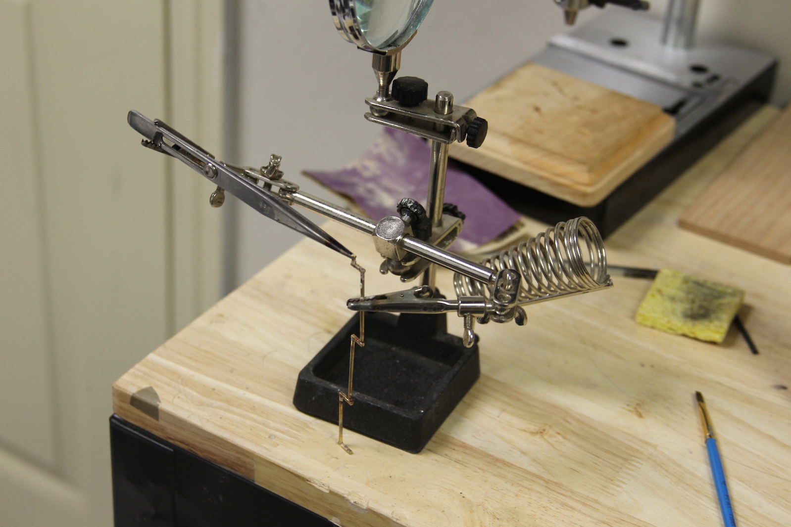 My first attempts at silver soldering were actually pretty successful. What was conveyed to me end up being pretty true – the most difficult part is finding ways to hold the tiny pieces in place as they’re soldered. The green stuff in the syringe in the back of the photo is flux – this is applied first and heated up. Then the silver solder paste is dispensed using a different syringe with a hypodermic like needed opening. Only a tiny, tiny bit is used. Then the torch is applied again until the paste turns to silver and melts into the connection. All sanded out the end product looks pretty good.