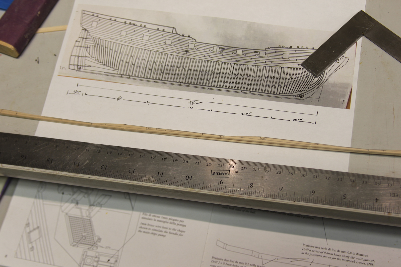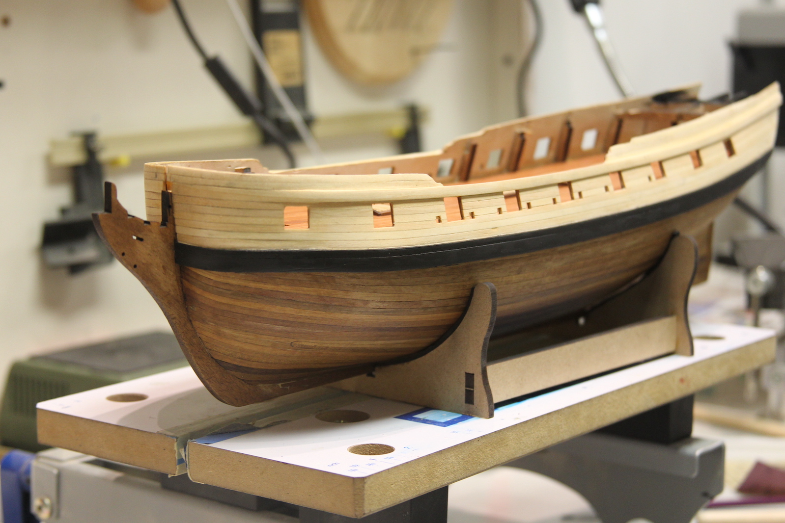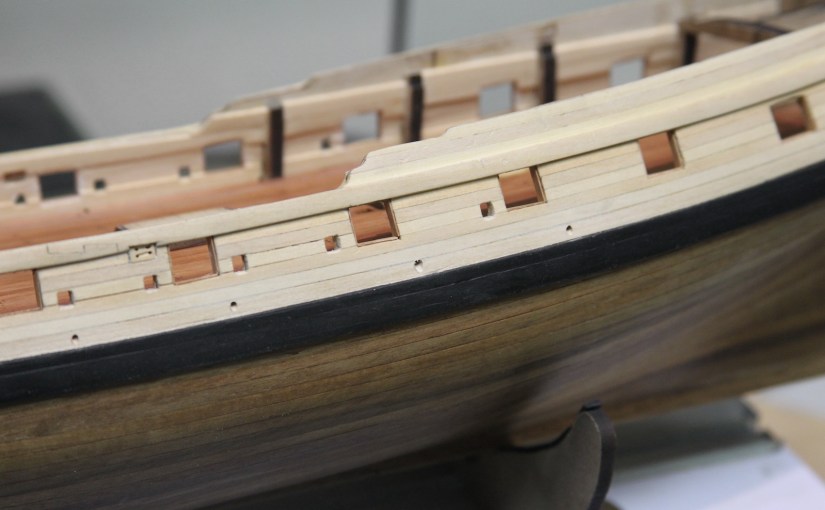 The main wales are a group of three planks along the water line of the ship. Because they are subjected to a lot of stress, they are connected in a very specific way called “top and butt” planking in which the two bottom planks are interlocked at different angles. I took the plans from the National Maritime Museum (NMM) and mirrored that pattern as well as I could. Using this pattern (as opposed to just strips of planking) adds a layer of authenticity to the build, even though you are barely able to see it because the wales are ultimately painted.