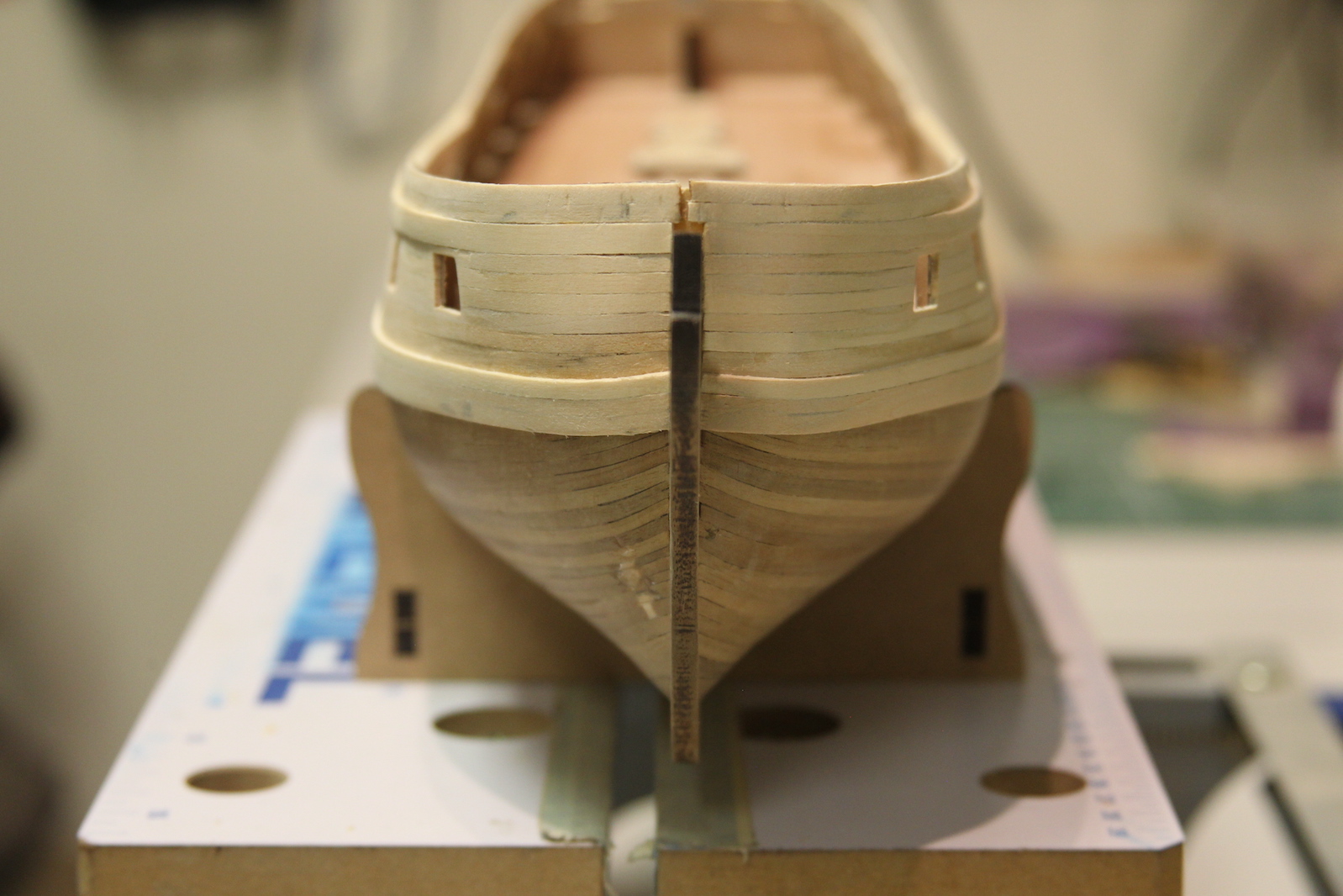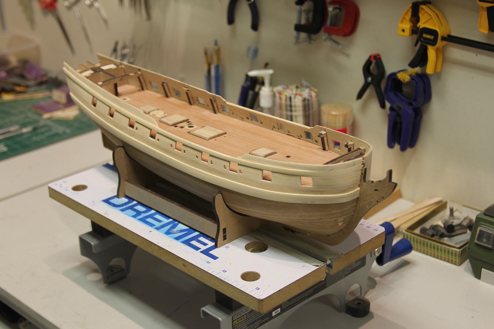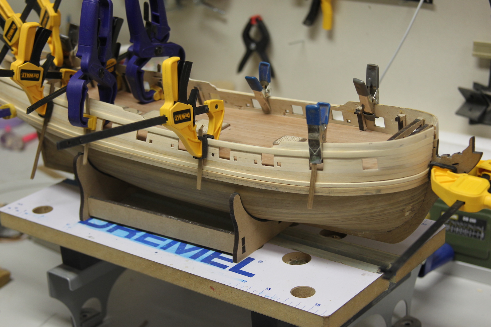 The main wales are a group of three planks along the water line of the ship. Because they are subjected to a lot of stress, they are connected in a very specific way called “top and butt” planking in which the two bottom planks are interlocked at different angles. I took the plans from the National Maritime Museum (NMM) and mirrored that pattern as well as I could. Using this pattern (as opposed to just strips of planking) adds a layer of authenticity to the build, even though you are barely able to see it because the wales are ultimately painted.