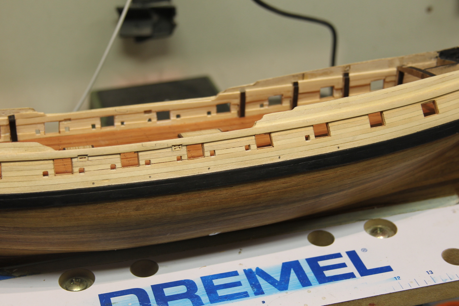 I like hand painting for the most part, but I was having difficulty getting the crisp lines I usually get. I blame this on my laser eye surgery. Before the surgery I was basically blind with anything past about 18 inches from my face. I had like – point me in the direction of the eye chart cuz I can’t see it – kinda vision. But – anything close was perfectly in focus. Great for ship / model building – not so great for… well, life. Now – I have 20/15 distance vision, which is awesome. Except, I can’t see crap up close. So, I now have varying degrees of reading glasses, magnifying head gear, etc. But, I’m still getting used to it and it has indeed affected things like painting and small carving. Anyway – not to make this some kind of “woe is me” story – but I opted for taping off the ship and airbrushing the paint on the wales instead. I new I could get the tape much more precise than a brush by hand.