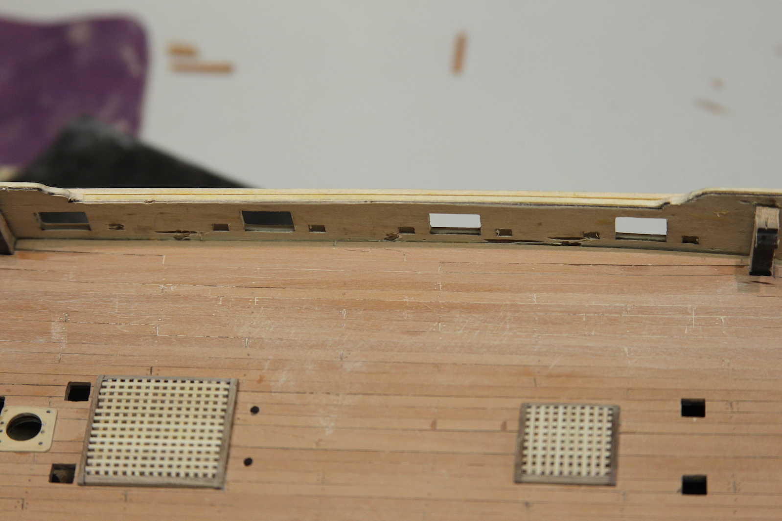 Once the deck was repaired I could continue planking the inside of the gun ports. Similar to the outer gun ports, one plank is laid at a time, then I carve out the openings for the ports (both gun and sweep).