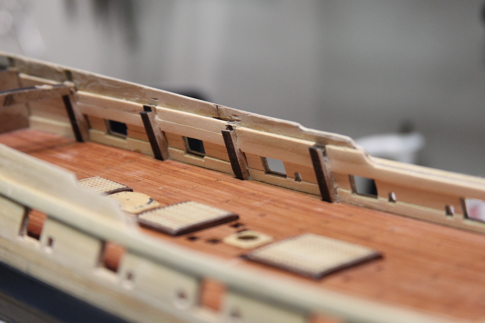 Next up, planking the inside of the gun ports. Similar to the outside, the inside is planked with a couple of different sizes and widths of boards that all serve pretty specific functions. The lowest plank is wider and thicker to facilitate the scuppers, the mid planks are thinner which allows the guns to be rolled up closer to the ports, and the upper planks are wider and thicker again.