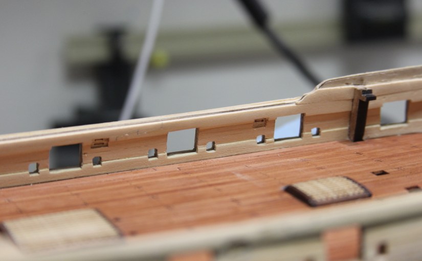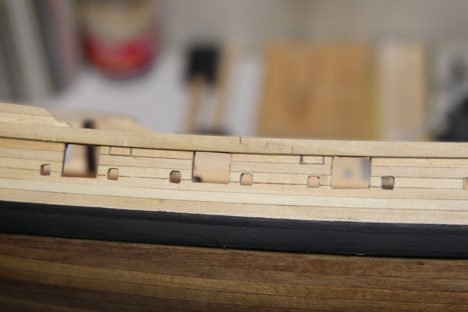 The last step of planking the gun ports is lining the ports themselves. Next step will be to mask off the ship and do some painting.