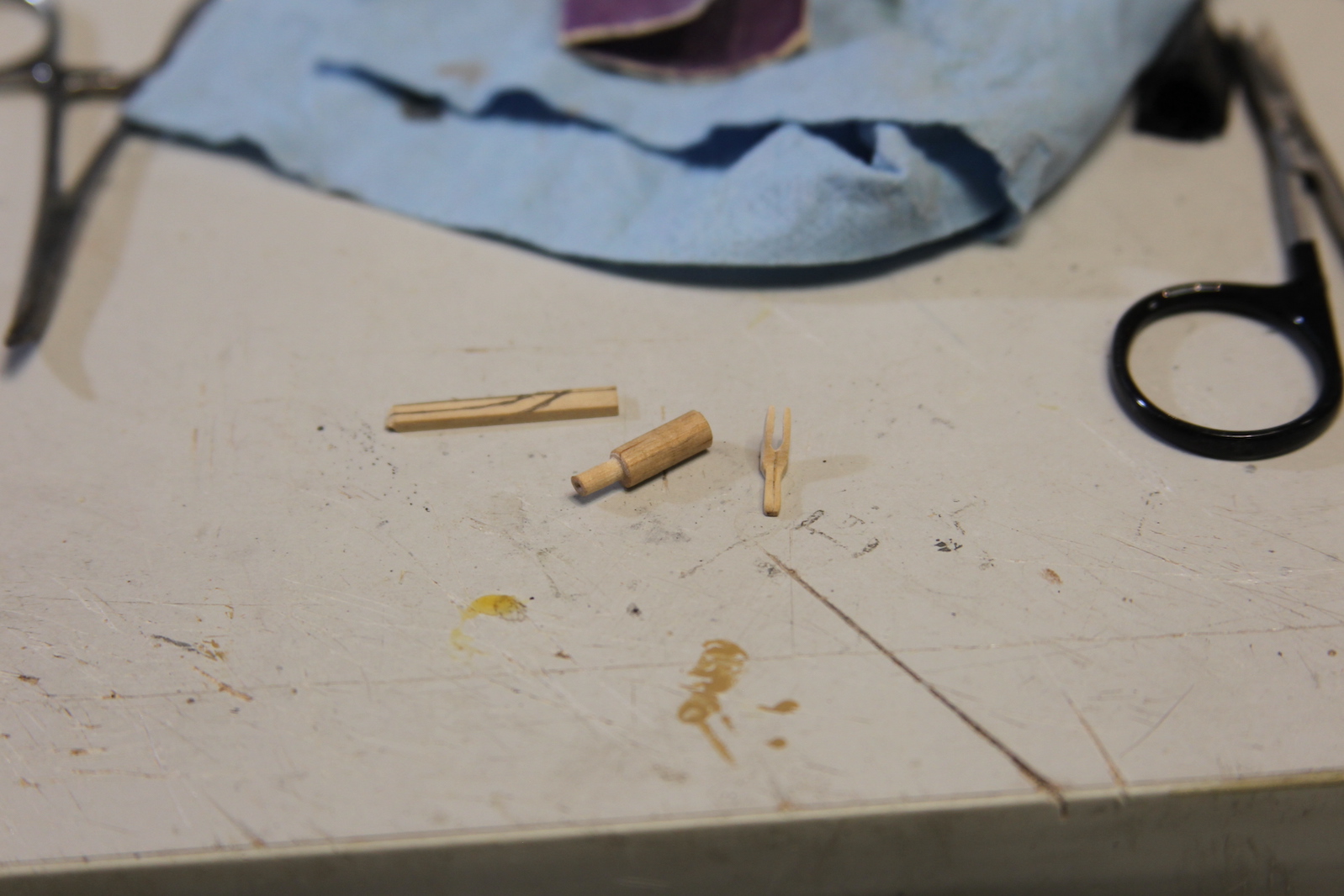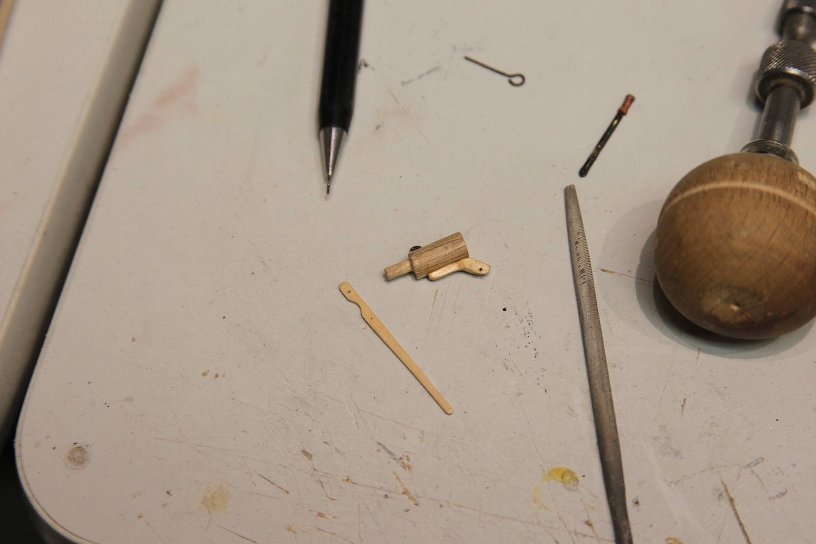 As you can see above, I cut one dowel for both pumps, split it in two, then drilled out the centers. The handles (called brakes) and the ‘cheeks’ which held the handles were shaped and carved from boxwood. After they were formed, I filed down the insides of the cheeks to create a slot in which the brakes could sit and form the lever for the pump.