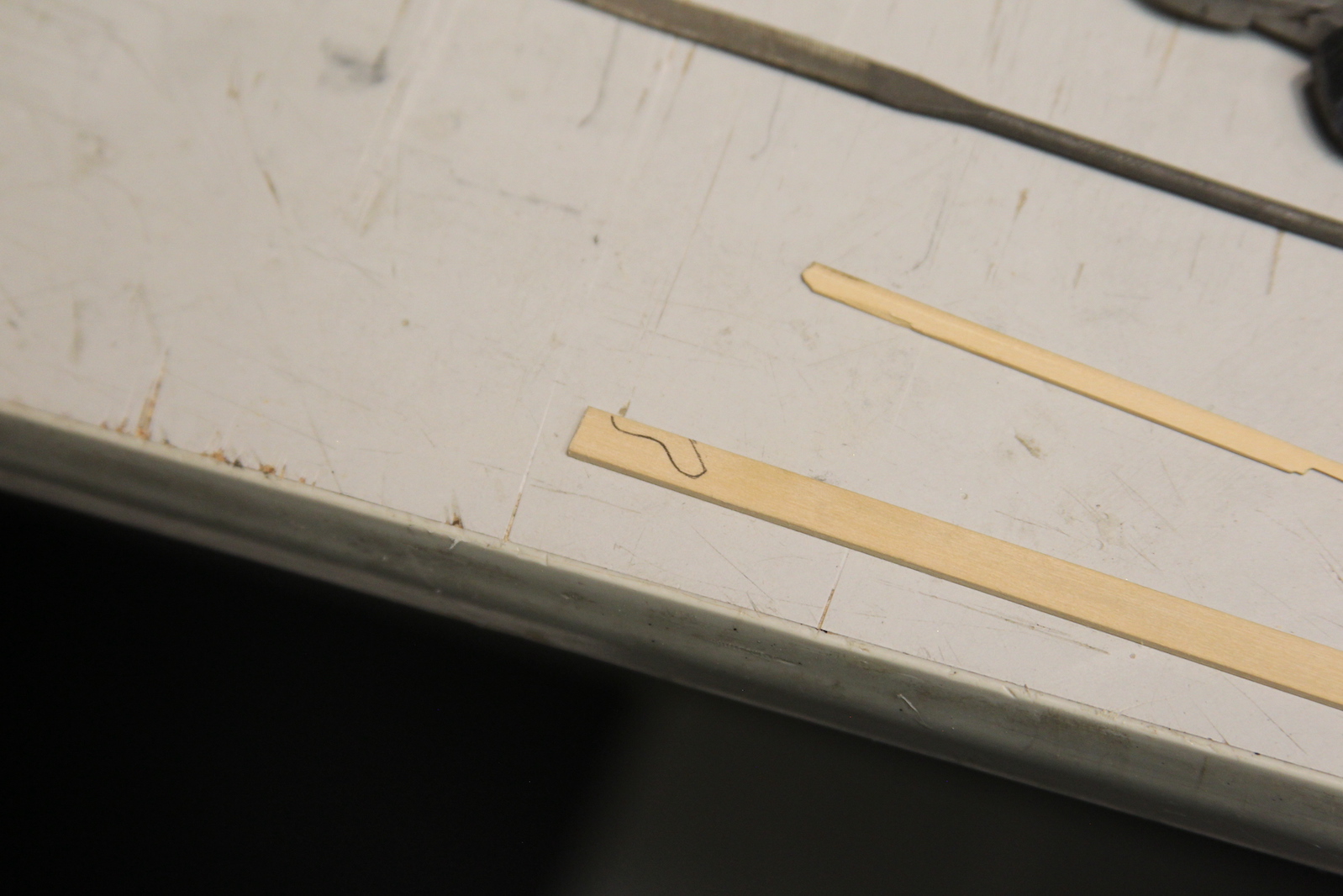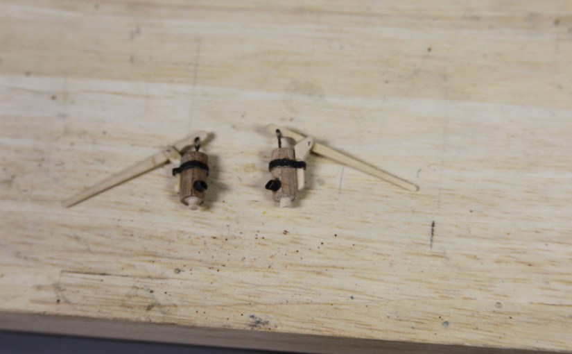 Pumps are finished up with a brass tube for a spout, wire eyelet for spear (that goes down into the pump), and a metal strap to hold it all together. These will be set aside with the other deck fixtures ready to mount later.