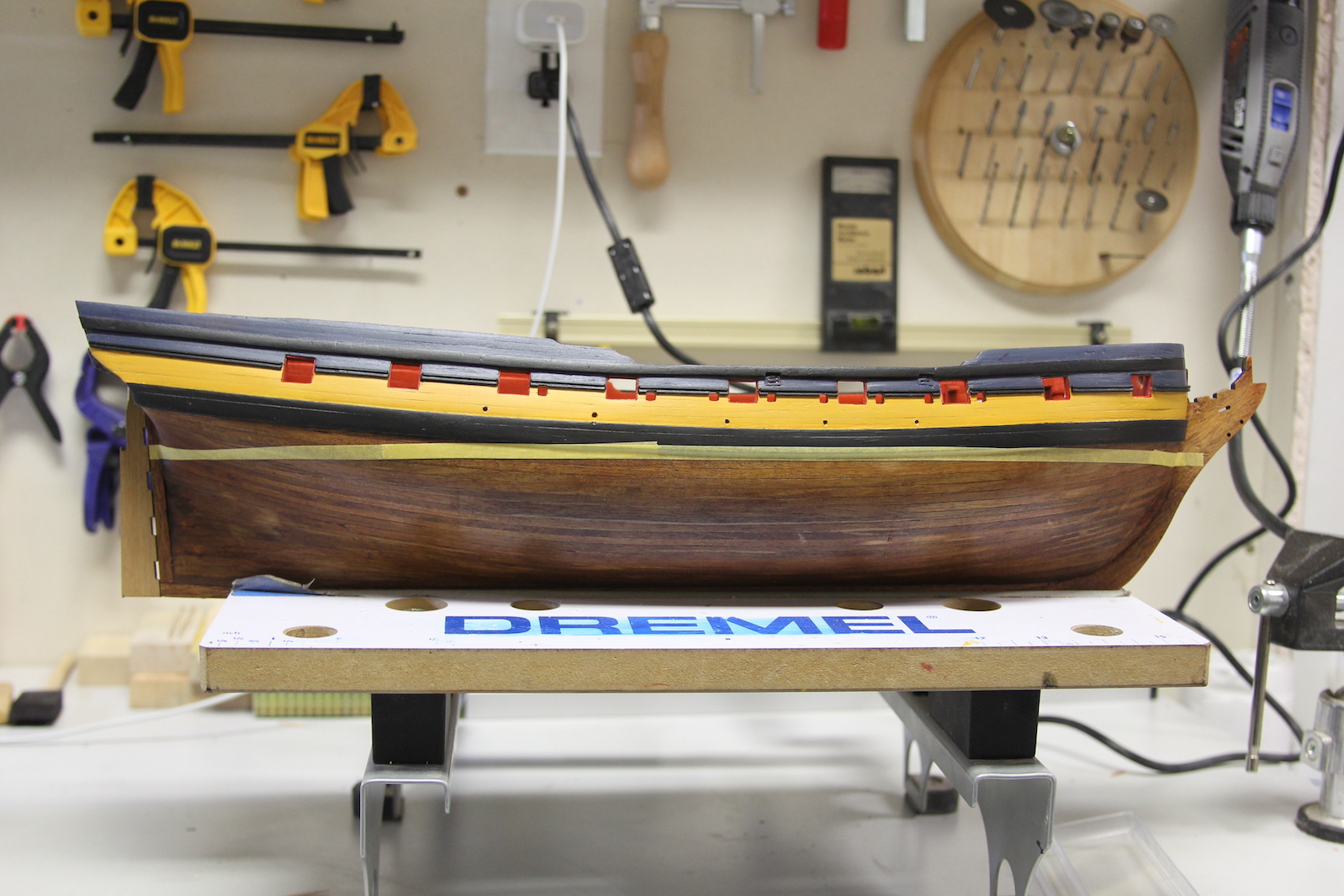 Nonetheless, I’ve never coppered a hull on a build before and it felt a daunting task.  First steps are to measure an accurate and straight waterline.  To do this, one needs to make sure the deck of the ship is properly parallel to the horizon both port to starboard and forward to aft – this is how the ship would sit in the water with a balanced ballast (weight in the bottom of the hull).  To do this, I set up a couple of different kinds of levels, then manufactured a waterline marking using a table tripod with a pencil attached.  Obviously it’s critical to make sure the pencil mark is consistent along the hull as well as on both sides.  The subsequent pencil mark is difficult to see on the walnut, so I marked it off with Tamiya model masking tape.