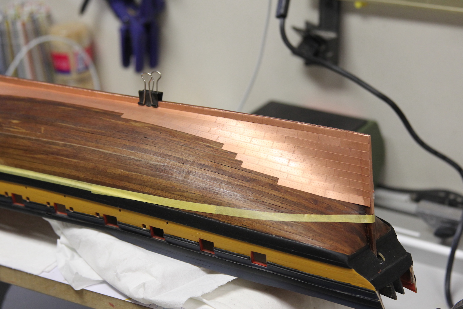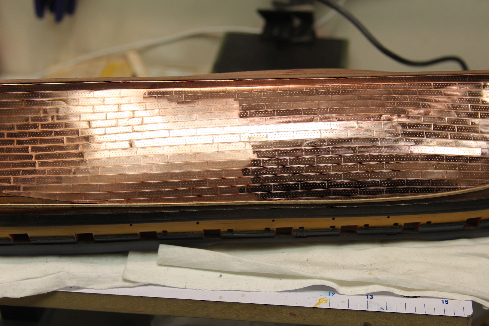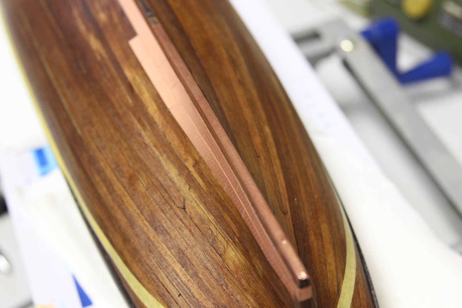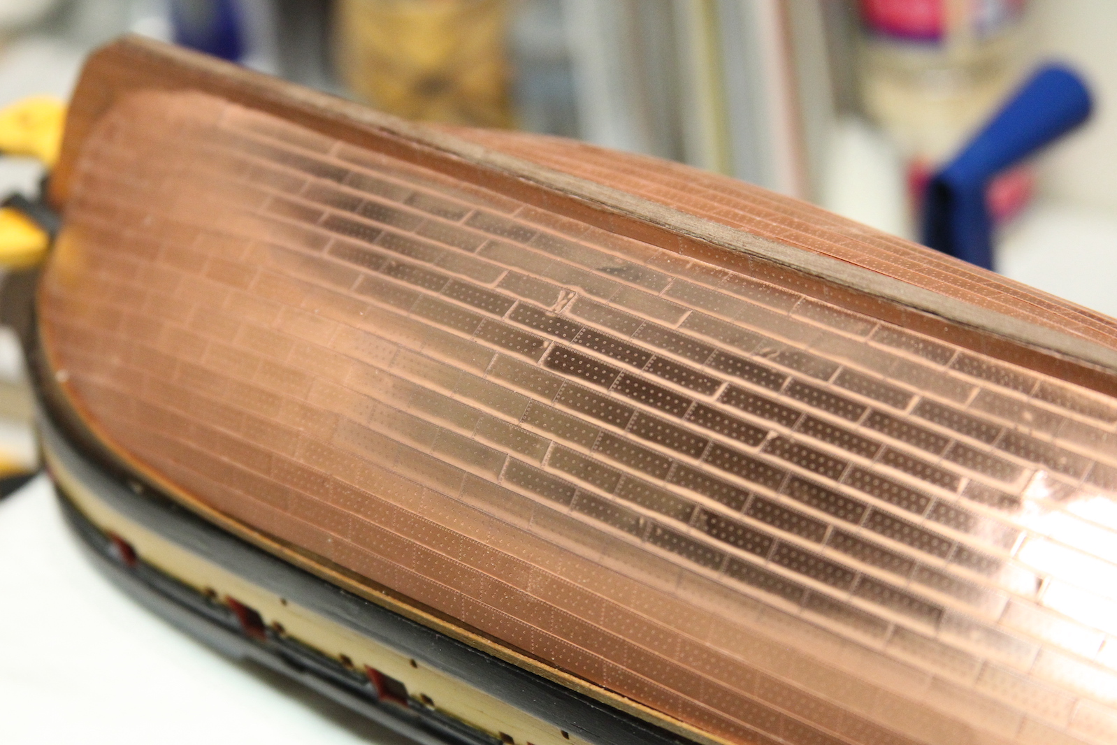 After the entire hull is done, an additional ‘batten’ is added along the waterline to seal the copper – I’ve represented this by using a walnut strip to match the color of the exposed hull planks. Much of the time this area is panted black along with the main wales, but I’m choosing to leave it as it’s natural color. From there, it’s time to polish up the copper.  I started by using a 600 grit soft sanding sponge so I could get into the nicks and crannies without fouling up the copper. This is done VERY lightly so as to not catch the corners of the plates and bend them out of ship (which I still did on a couple of occasions).