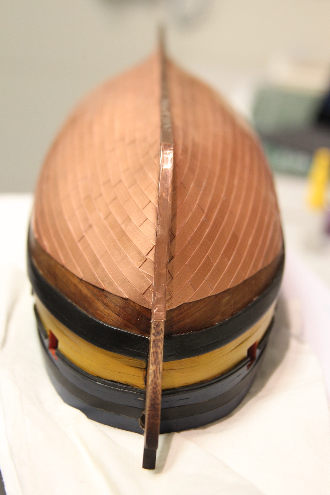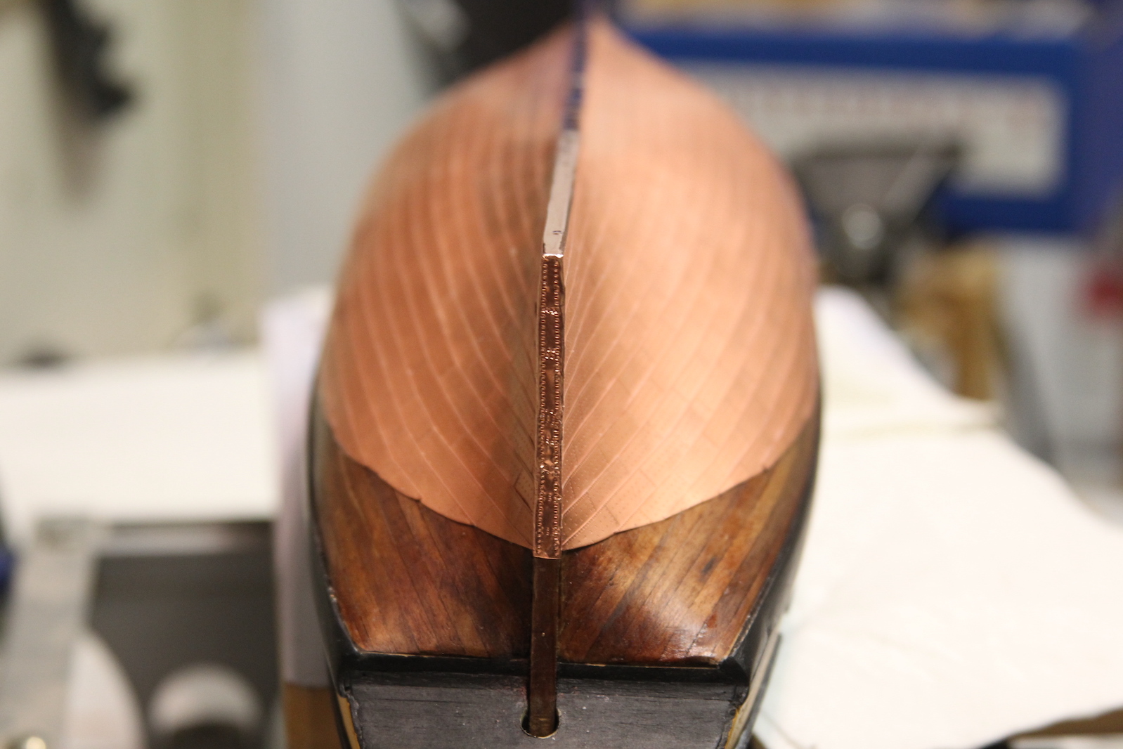 The plating itself is done parallel to the stern and each row follows the lines of the previous as you work your way up from the keep with the absolute slightest overlap from the previous row. The plates begin to angle as they follow the lines of the hull from stern to bow, and some very, very tiny adjustments to the angle need to be made along the way. Once the plates reach the waterline they’re trimmed off to create a straight line. For the keel itself (and the bow and sternpost) I used a copper strip which will then be marked with a bolt pattern and the strips along the sides are trimmed flush. The bottom of the ship will eventually have an additional “false keel” over the copper. This was done in case the ship ran afoul on rocks or other items in the water – the false keel was much easier to replace than any damage to the hull itself.