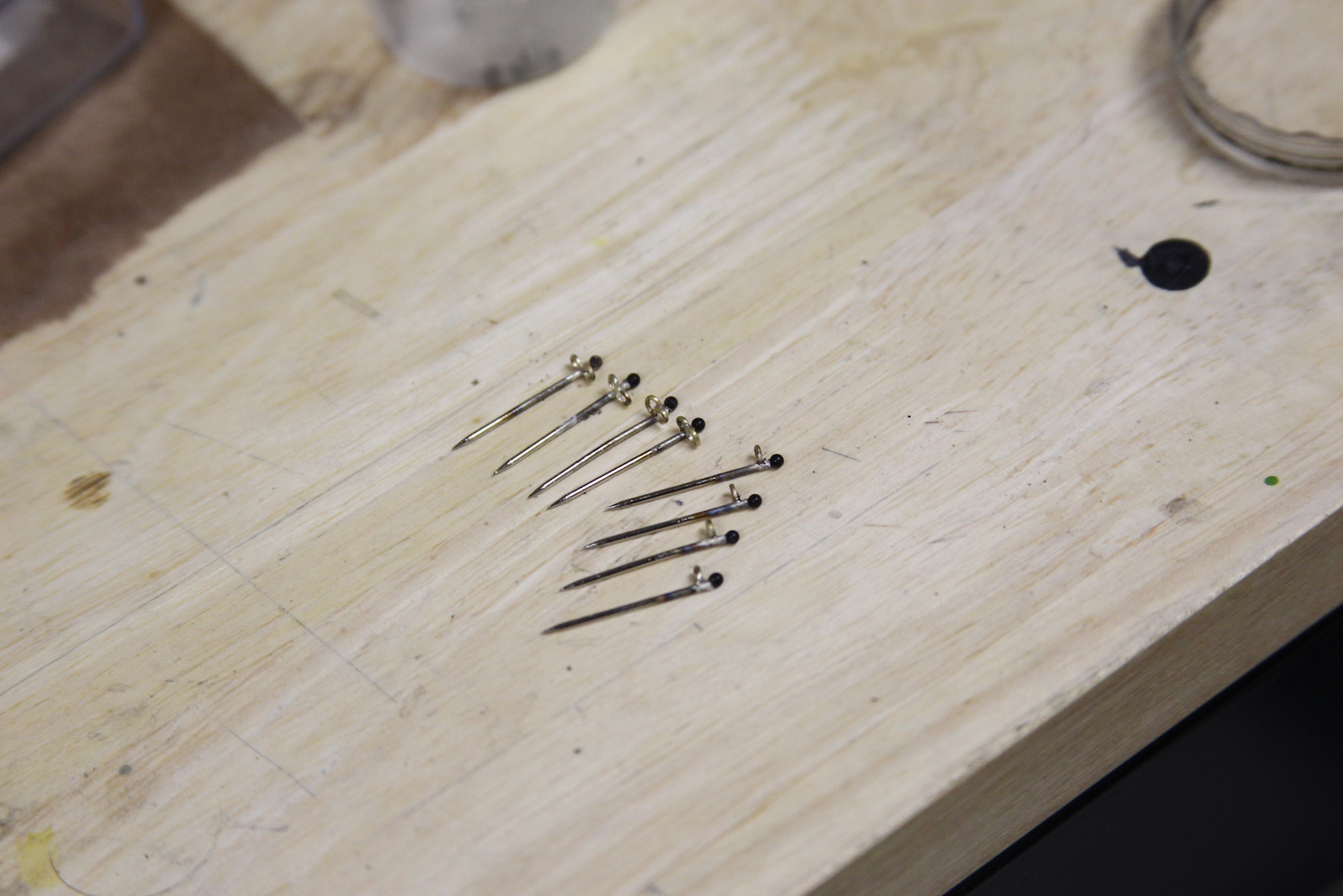 I fabricated my stanchions out of these T-Pins that I snapped off. I wanted something with a pointy end that would facilitate mounting. I then soldered some rings to them.