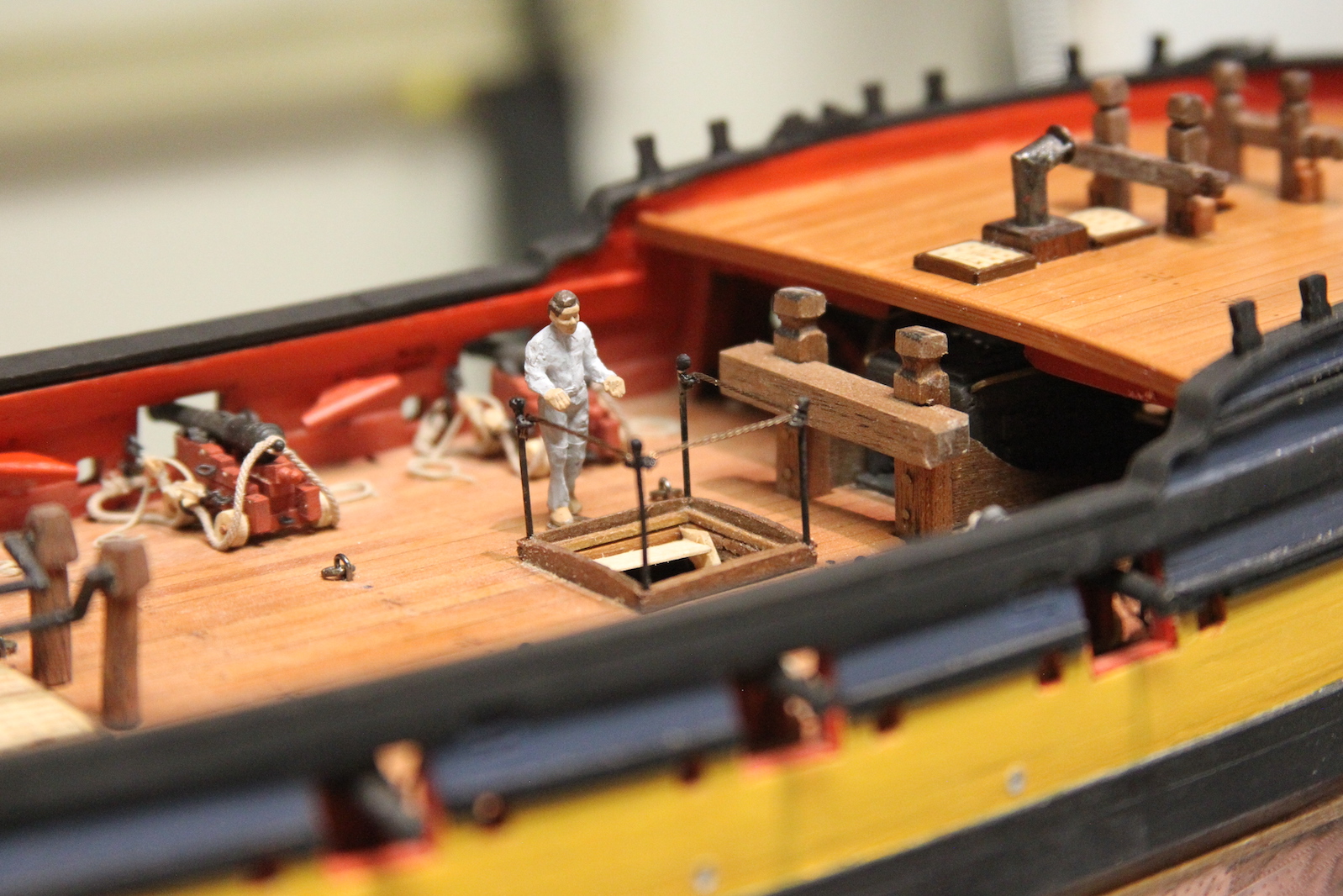 The open hatches on the deck which contain stairs also need to have some sort of safety railing around them or else the sailors would surely fall to their discomfort. These railings are often made by simply mounting long eye bolts and running a string/rope along them – much like you’d see entering a movie theater. Since this is neither particularly accurate or (more importantly) cool, I wanted to elaborate a little.