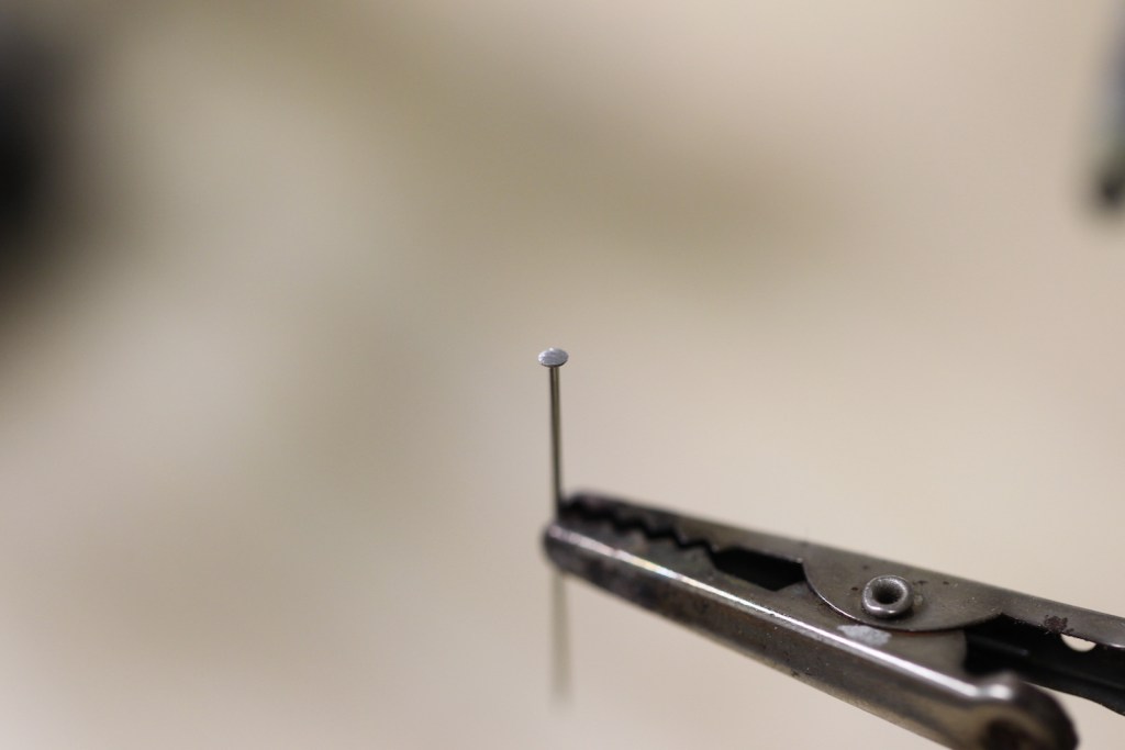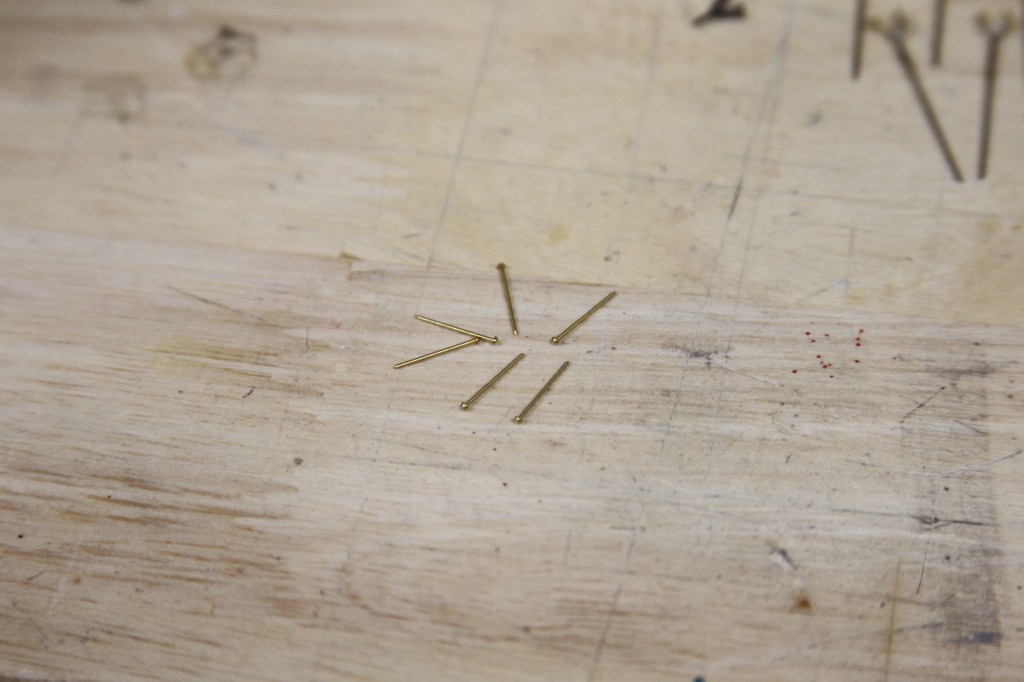 The guns sit upon these swivels in a small bracket that allows them to be moved up and down as well as back and forth. These small brackets were created out of brass strips that are shaped, then drilled out on the sides. I used pins with shaved down pin heads as the base of the mount. The “small as a pin head” idea also provides an idea of just how small of a scale we’re working with here.