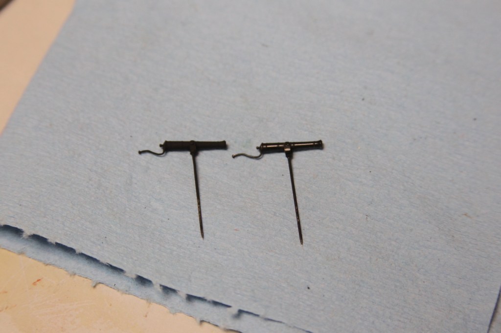 After a couple of days of contemplating how to get this handle right, I eventually though of the ever handy .020″ mico-mark tiny nails that I’d used on the rudder (and here on the brackets). So why not take another run at the guns using the longer version of those? This got me much closer to what I wanted – as the handles themselves are more to scale with the guns.