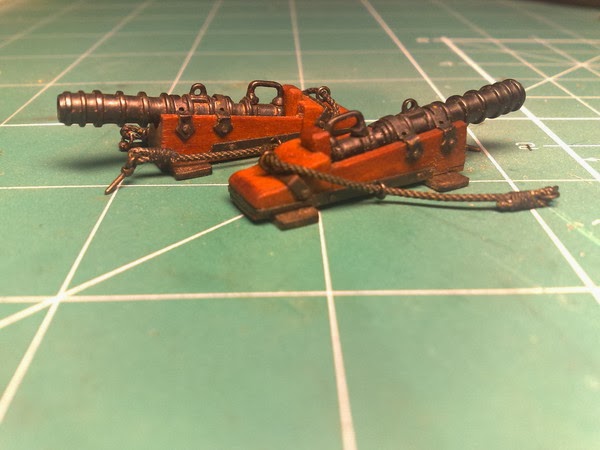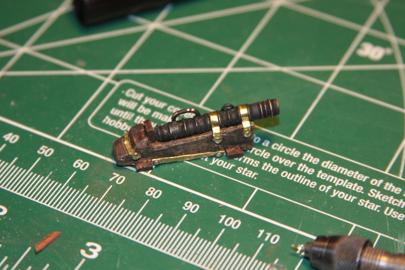 I carved the base pieces out of solid blocks of wood using both hand tools and a dremel. After the bases were carved out to hold the bombard barrels, the feet and backing are added, each is stained. The metal strips are cut and molded brass strips. The rivets are straight pins cut short and inserted into pre-drilled holes through both the brass strips and wood.