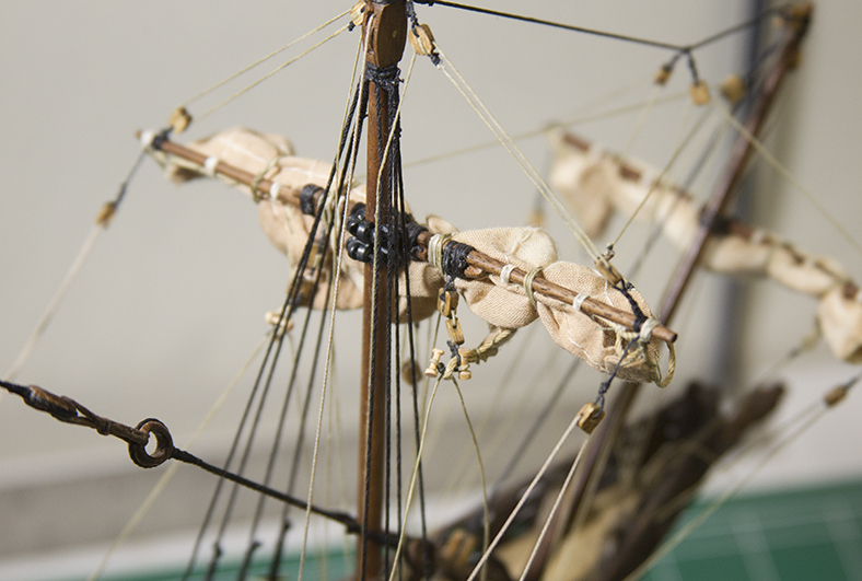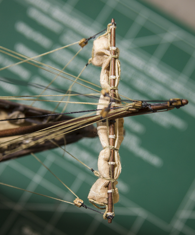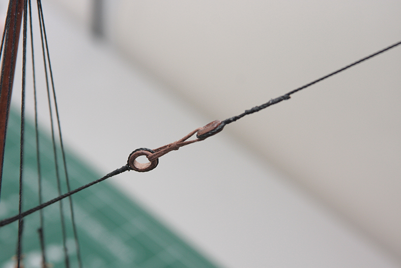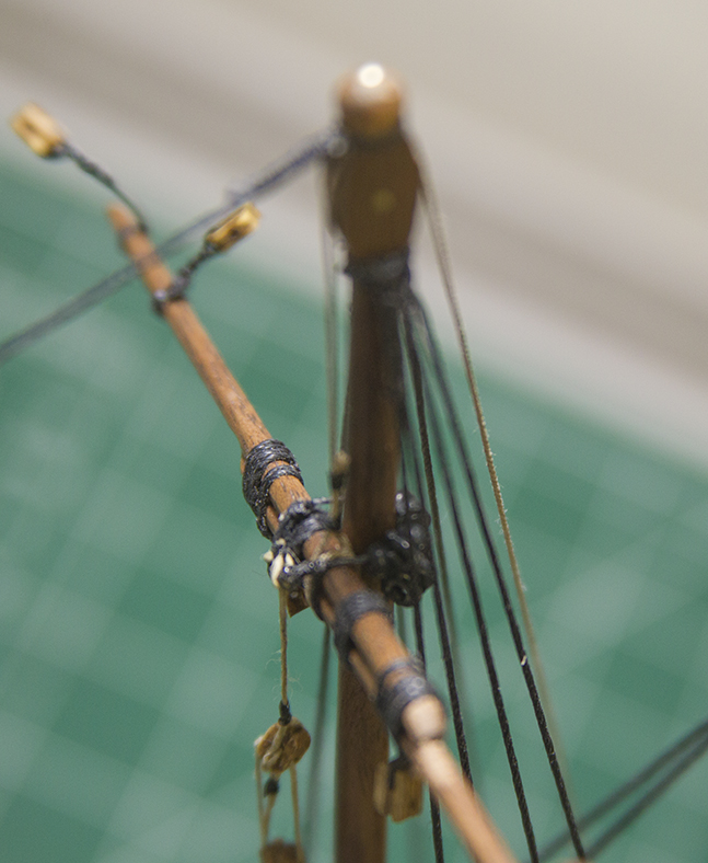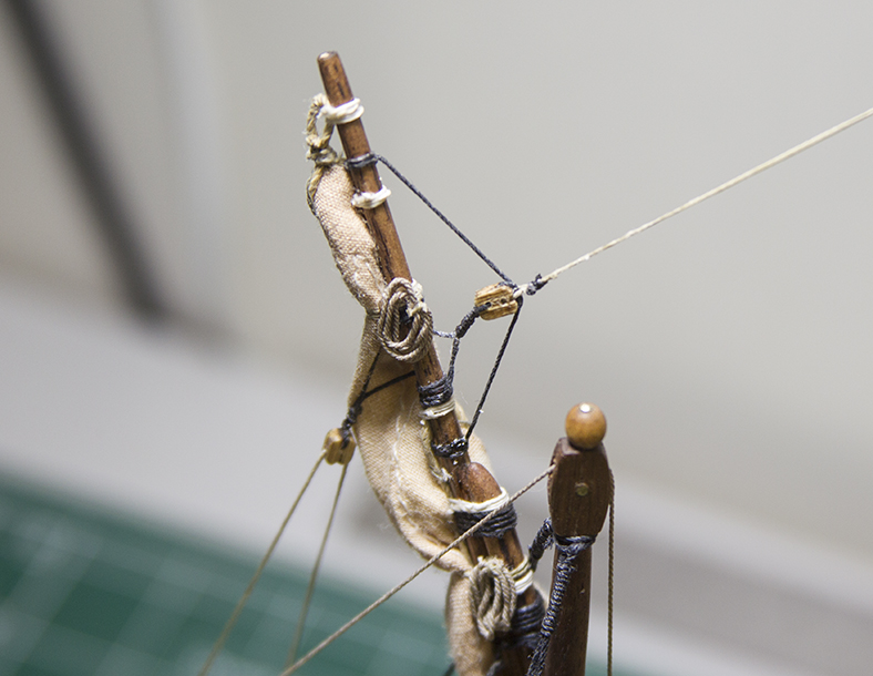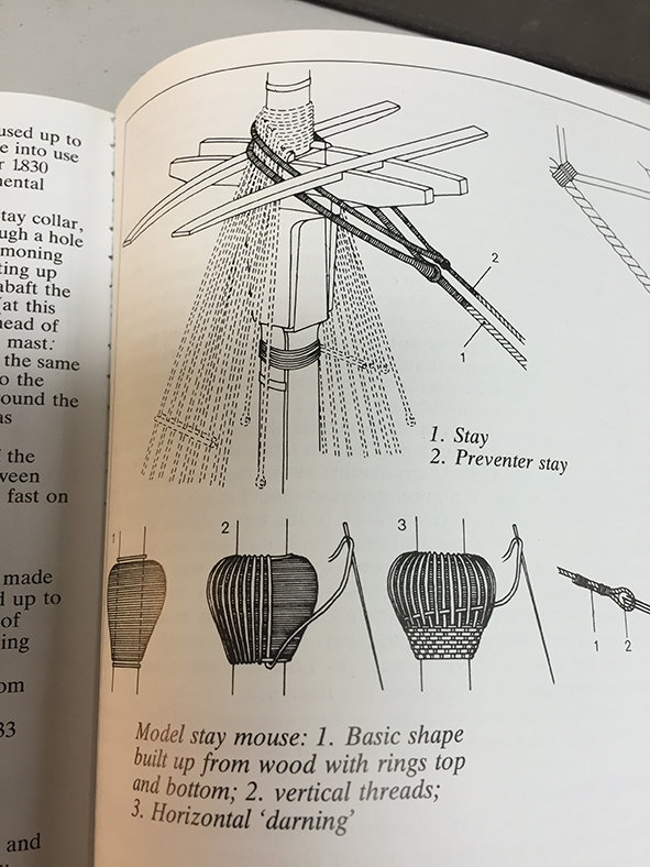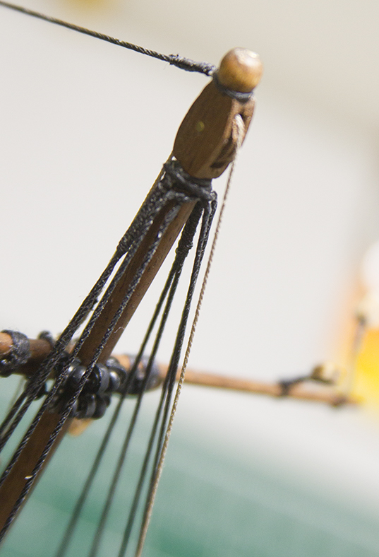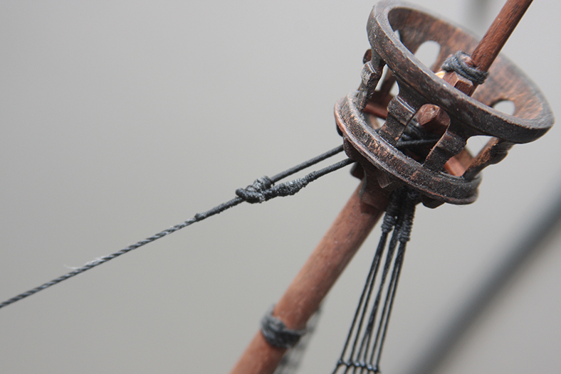 The upper end of the mainstay is wrapped around the mainmast, through the crow’s nest, and reconnected using a loop and a “mouse” – essentially a woven knot. Clearly wrapping and weaving the knot as illustrated was too detailed for a small scale, so I simulated the mouse knot with a basic wrap.